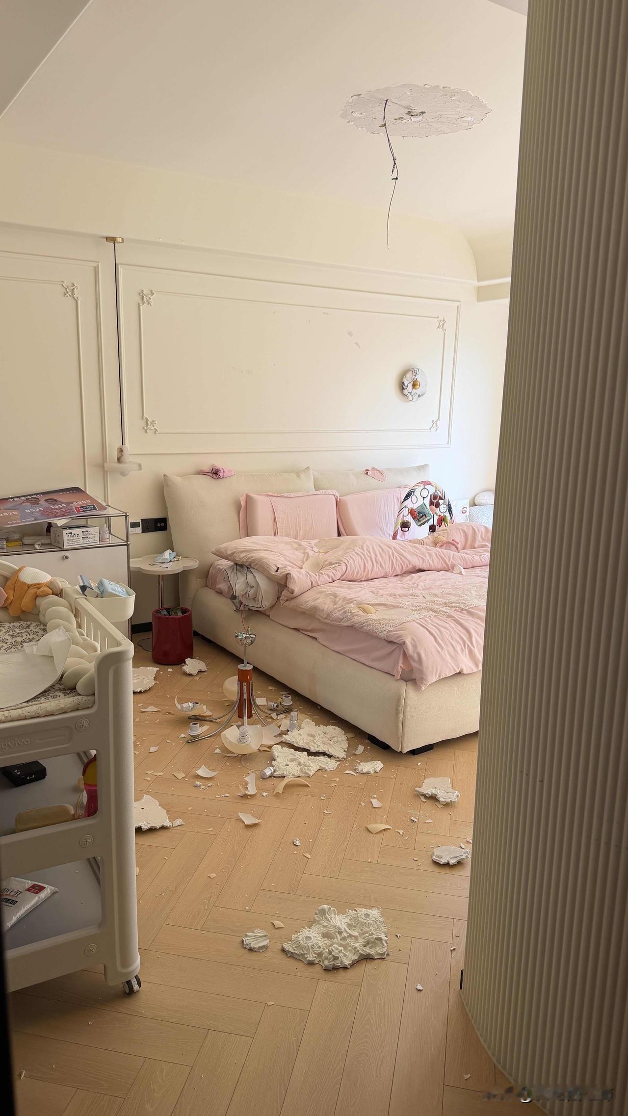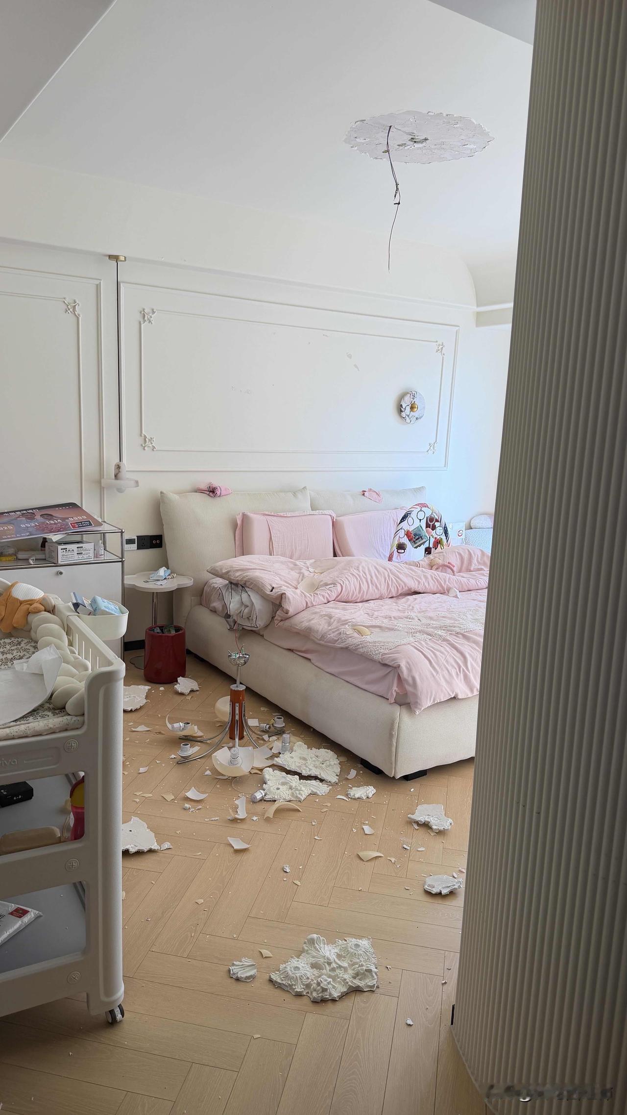 差一点掉下来就砸到人了 石膏灯盘避雷 时隔一年我又回来啦 法式石膏灯盘吊顶避雷 太危险了 最近一个月家里都没住人 今天回去就这样了 万幸没有被砸到 简直是佛祖保佑 爱睡懒觉的我 如果最近住在这个家里 我就是第一受害者 后果不堪设想 所以 大家以后装修 千万不要搞太重的石膏线贴在顶上 真的非常危险 实在是喜欢 选轻一点的 或者泡沫内里的 不然掉下来真的会砸死人 我这个石膏灯盘就属于自重非常重的 当时为了质感好一点 选的最好的 纯石膏制作 所以石膏灯盘受潮之后掉下来 重量把吊灯都直接砸下来了 想想都后怕…