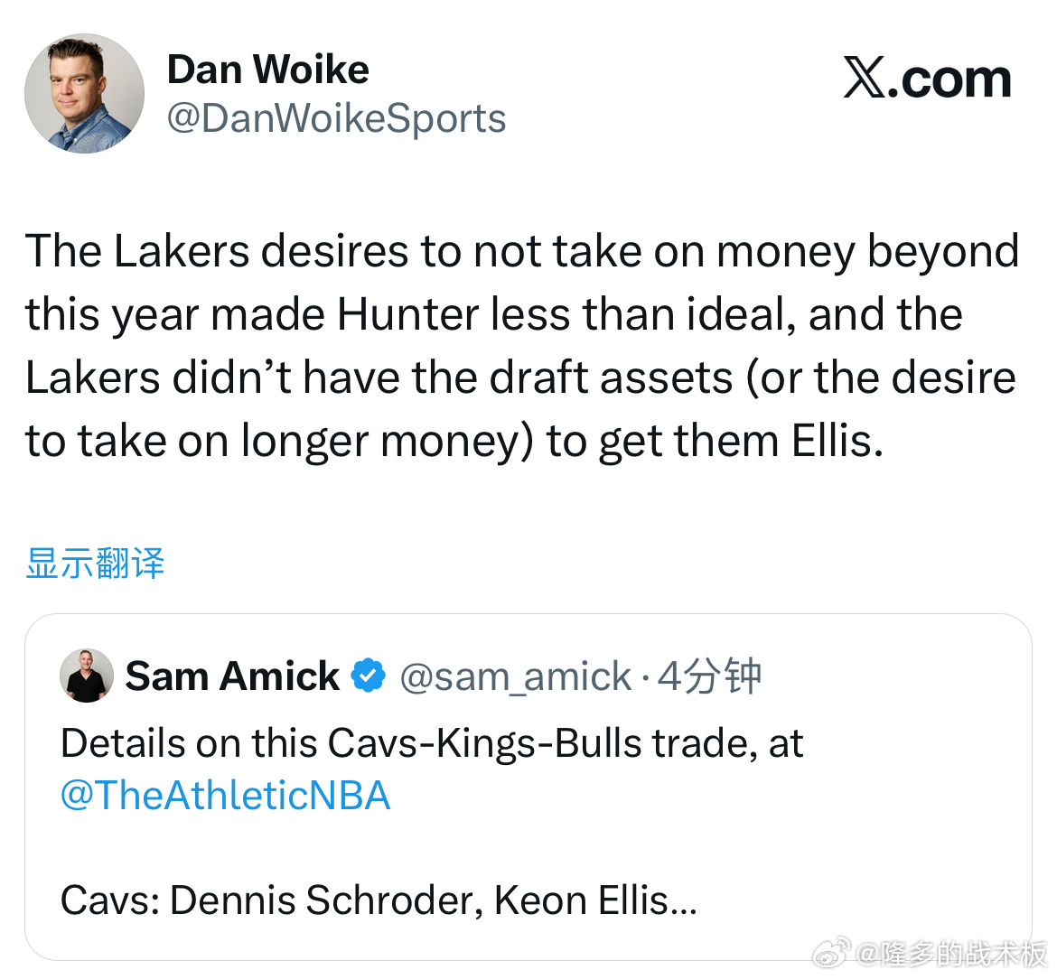 Dan Woike:湖人不愿承担今年之后的薪资合同,这让亨特成为非理想选择。
