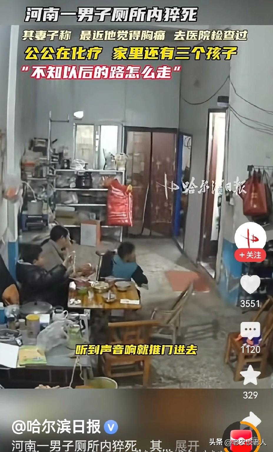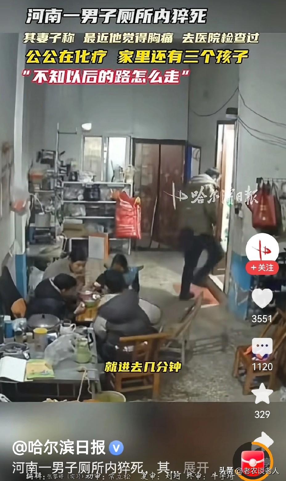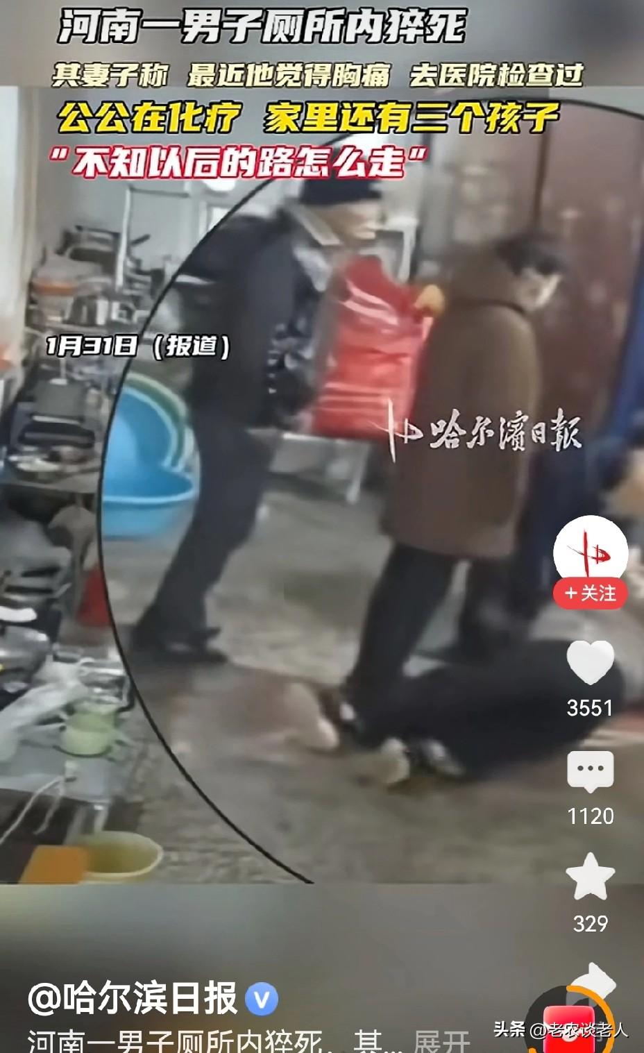 丈夫厕所内猝死,妻子痛哭不已! 寒冬腊月,数九寒天,雪花飘落,冰天雪地,天气格外寒冷,温度极低,是最危险的心脑血管疾病高发期,如脑梗、心梗、肺栓塞、中风、猝死等等疾病。 据媒体2月1日报道,河南一男子早晨在吃早餐前,进厕所小便,突然倒在厕所里,当场猝死。他的妻子表示,近天丈夫心口疼痛,因为,家里的公公在医院里化疗,家里经济非常紧,她丈夫舍不得到医院去花钱看病,因此,才导致了这场悲剧的发生。他的妻子说,现在公公在医院里化疗正急需要钱用,家里还有三个孩子需要抚养,她真的不知道以后的日子该怎么过? 在此提醒大家,在寒冬腊月,数九寒天的时候,气温极低,有心脑血管疾病的人,一定要防寒保暖,千万不要让低温寒冷,诱发这些危险的疾病发作。 每天早晨,从起床的时候到上午9:00之内,是这些危险性疾病发作的高峰时间段,提醒有心脑血管疾病的中老年人,要注意在这段时间内,不要做一些剧烈性的运动,尽量保持平静,要稳定思想情绪,千万不要生气和发脾气,不要欢喜过度让心情激动起来,要保持平稳的心情,并且要注意防寒保暖,多喝开水,不要接触凉水或受冻,避免血管突然收缩,诱发疾病发作。 以上是本人观点,如有不妥,请大家在留言区去,留下你宝贵的意见,并积极参与评论。特邀请大家一起探讨健康问题。 全球第六代荣放中国交付备受关注男子厕所内猝死 妻子发声