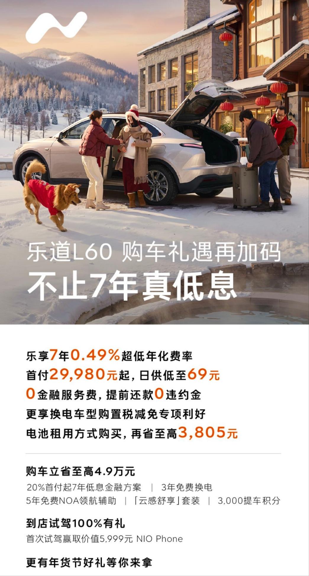 乐道2月购车新政策发布,7年超低息无套路,2.1-2.28购车可享7年0.49%年化费率,首付 20%起,日供最低69元起。 0金融服务费+0提前还款违约金,线上审批秒到账,换电车型购置税再省至高3805元,电池终身无衰减焦虑。 具体到车型,L60首付29980元起,综合权益至高4.9万;L90首付35960元起,综合权益至高4.1万,还享免费换电、NOA 等权益,计划年前买车的朋友,这波政策能吸引到你吗?【来自懂车帝车友圈】