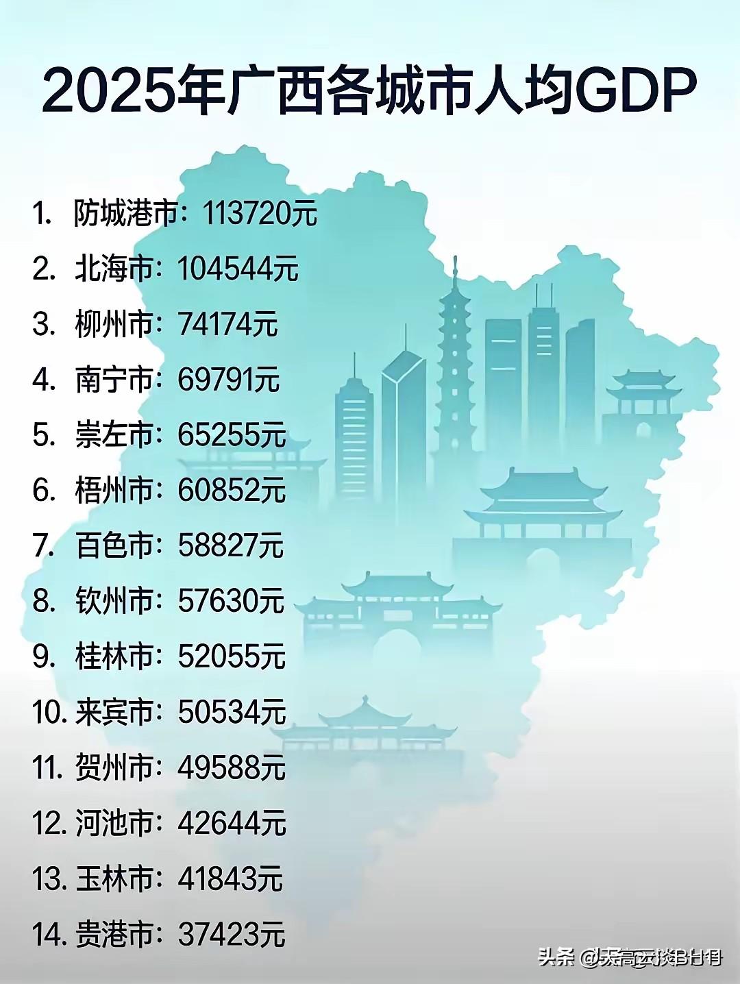 来看一看广西各市2025年城乡居民人均可支配收入数据,贫富差异一目了然! 以下按全市居民人均可支配收入确定排序,三项数据分别为: 全市居民人均可支配收入、城镇居民人均可支配收入、农村居民人均可支配收入(单位:万元) 1,南宁39659、48375、23146 2,柳州39412、47689、22427 3,北海37949、47591、23523 4,防城37401、45960、24135 5,玉林36412、46978、25354 6,桂林36010、47202、24158 7,梧州33659、44089、21327 8,贵港33224、42297、23645 9,钦州31906、46270、21800 10崇左31390、45018、19871 11贺州31149、43345、20108 12来宾29444、42849、20418 13百色28378、42512、19485 14河池25171、38901、16231 综述:南宁、柳州、北海占据了全体居民收入和城镇居民收入前三名,可以说是广西最富的三座城市! 玉林农村居民收入最高,唯一超过2万5,而河池、百色、崇左三市的农村居民收入低于2万。 不忍心说出但事实存在:河池“最穷”,三项收入指标均排名末榜。