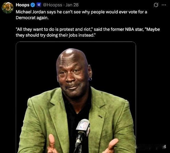 2026年1月,网络用户传播了一则谣言,声称NBA传奇人物迈克尔·乔丹表示他不明白为什么人们还会投票给民主党,并补充说:“他们只想抗议和暴乱。也许他们应该好好工作。” 这段所谓的引言流传之际,美国各地爆发了针对美国总统唐纳德·特朗普移民执法政策的大规模示威活动,尤其是在明尼阿波利斯,联邦特工在那里枪杀了雷妮·古德和亚历克斯·普雷蒂。 一些评论者似乎将这则谣言误认为是真实事件的报道。