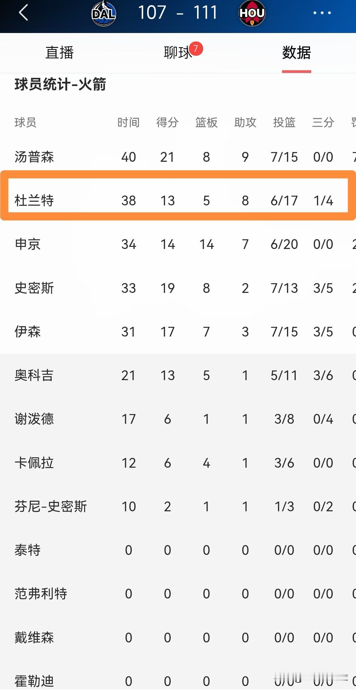 火箭超级巨星杜兰特真是太让人惊讶了!虽然今天火箭在主场以111:107战胜独行侠,但是向来以稳定高效著称的杜兰特却打出了非常低效的表现,他在首发出战的38分钟里,投篮17中6,其中三分球4中1非常低效的得到13分,他的场上正负值为+1。 坦白说,对于杜兰特在本场比赛中的进攻表现,我真是非常的惊讶,他万万没有想到他会如此的低效。