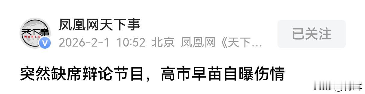 突发!高市早苗受伤,重要活动被紧急取消!高市:他们太用力了 2月1号当天上午,按照高市早苗的原计划本应该参加NHK的一档重要节目,宣传此次竞选的一些理念。然而,高市早苗本人当天上午却未能出席。原因是这位日本女首相受伤了。 随后高市早苗通过社交平台进行了回应,说自己的手臂受伤了,原因是近期在进行现场演讲的时候与一些热情的支持者进行握手,有些人用的力气太大了,再加上高市早苗本身就有旧伤,所以手臂受了伤。不过高市早苗强调,医护人员已经对自己的伤势进行了处理,不会影响下一步的正常工作。 看得出来,高市早苗解散众议院之后,把绝大多数的精力都放在了搞竞选这件事情上。因为高市早苗为了确保两大派系得到半数的席位,几乎是赌上了自己的政治生涯,只要能够一定程度控制众议院,就可以通过包括集体自卫权在内的一些武装外扩的法案,就可以让日本完成军国主义复辟的初期准备。这对于高市早苗这个极右派的政客来说,实在是太重要了。 而这次主动对外回应自己的伤情,在我看来,很有可能是这位日本女首相打的一张苦情牌,想要获得更多的支持率。