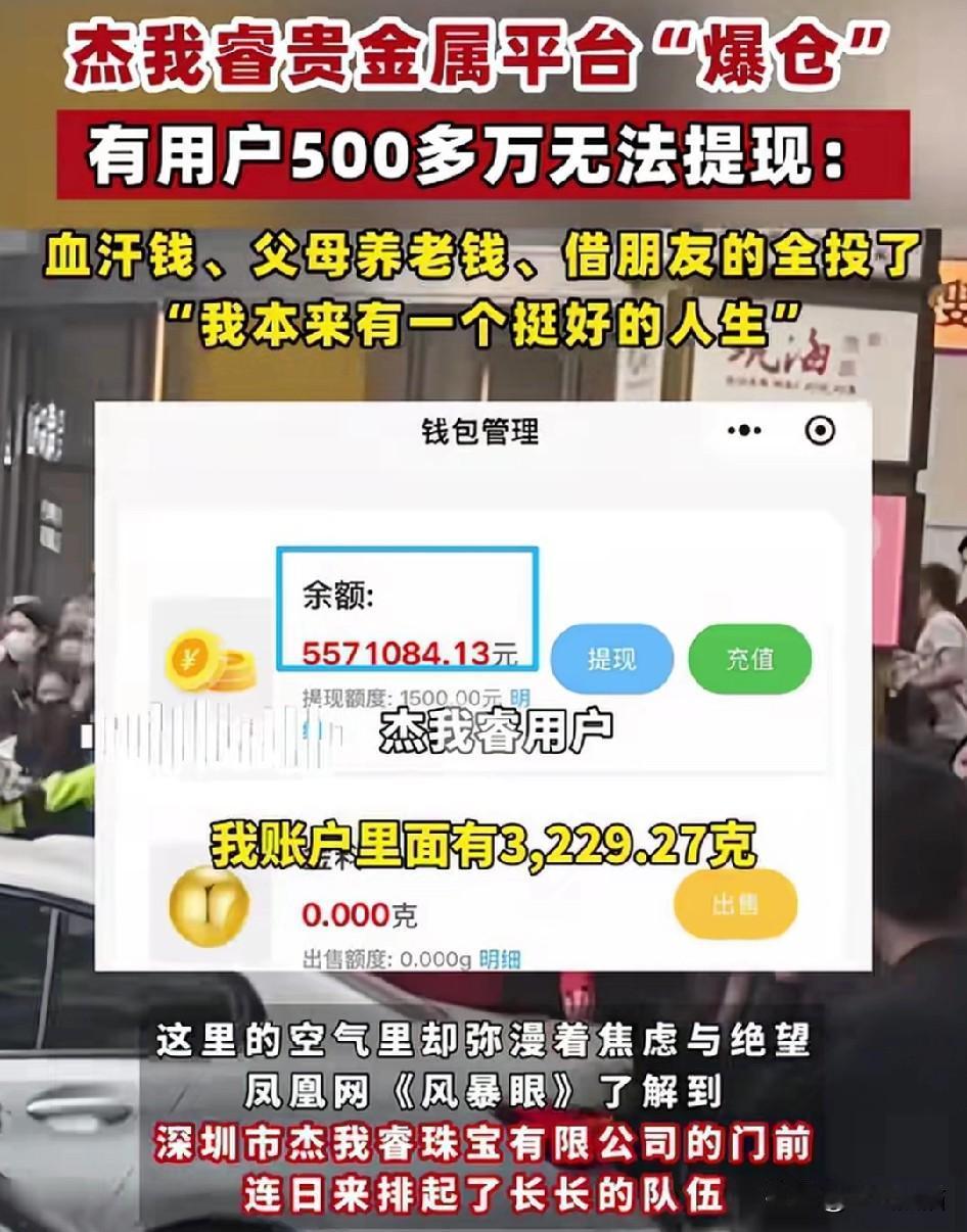 又一平台爆雷了,有客户500多万没法套现! 最近,金价,银价的疯狂上涨,让大家也彻底陷入了狂欢,当然,大家也没有看到这背后的危险。 根据深圳网的消息,深圳杰某睿公司门前聚集了大量人群,是因为这些客户在该金属平台的投资根本没法取现。 一个宝妈哭诉说,自己在里面投了500多万,其中有不少是借的亲戚朋友以及银行的,本来以为自己不用上班就可以安稳的过日子,没成想自己又被套牢了。 前几年的金融平台接连暴雷的时候,就有很多受害者发誓不会再碰,起码不会再加杠杆,但是当看到金属疯狂上涨的时候,还是抵不住诱惑。