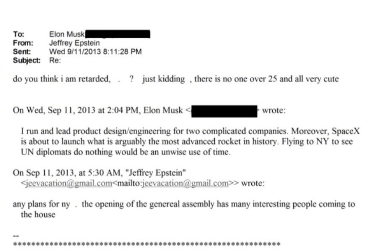 邮件内容是爱泼斯坦邀请马斯克在纽约联合国大会期间参加一场“有意思”的家庭聚会,马斯克以嘲讽的语气称看火箭发射比参加(酒囊饭袋的)联合国官僚聚会有意思,拒绝了邀请。爱泼斯坦继续回复称:自己不傻,不会搞那种无聊的聚会,强调参加聚会的都不超过25岁。意思已经很明显了。邮件到此结束,没有显示马斯克是否继续回复。