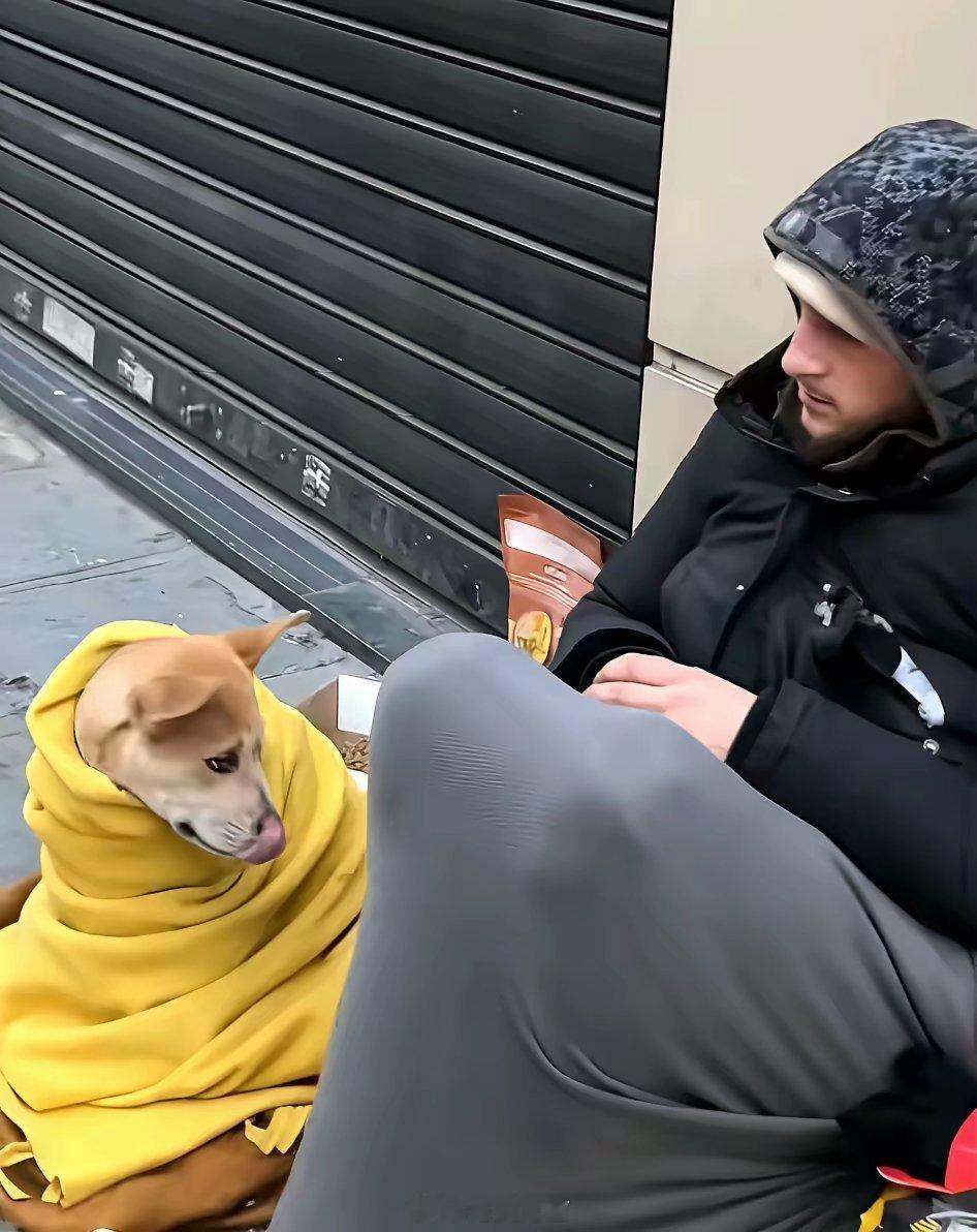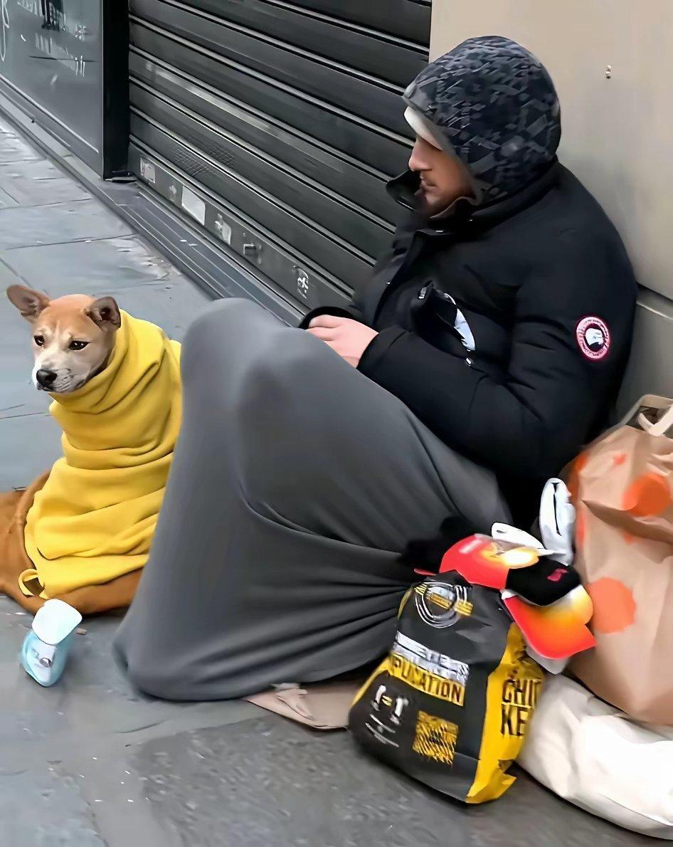 冬日巴黎街角的温度,远低于零度。可这位裹着正品大鹅的“丐帮先生”,和他的狗伙伴,却上演着一出令人莞尔的保暖大戏——人裹成北极熊,狗包成小粽子,一人一犬,仿佛将抗寒基因刻进了骨子里。寒风中他们缩在一起,用最严实的包裹,对抗着整个冬天的冷。这哪是乞讨?分明是一场街头行为艺术,主题叫:《这个冬天,我和我的狗绝不能感冒》。