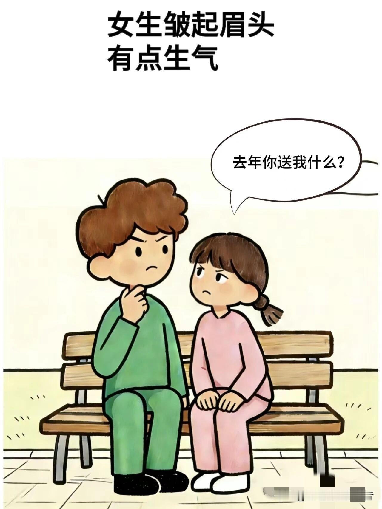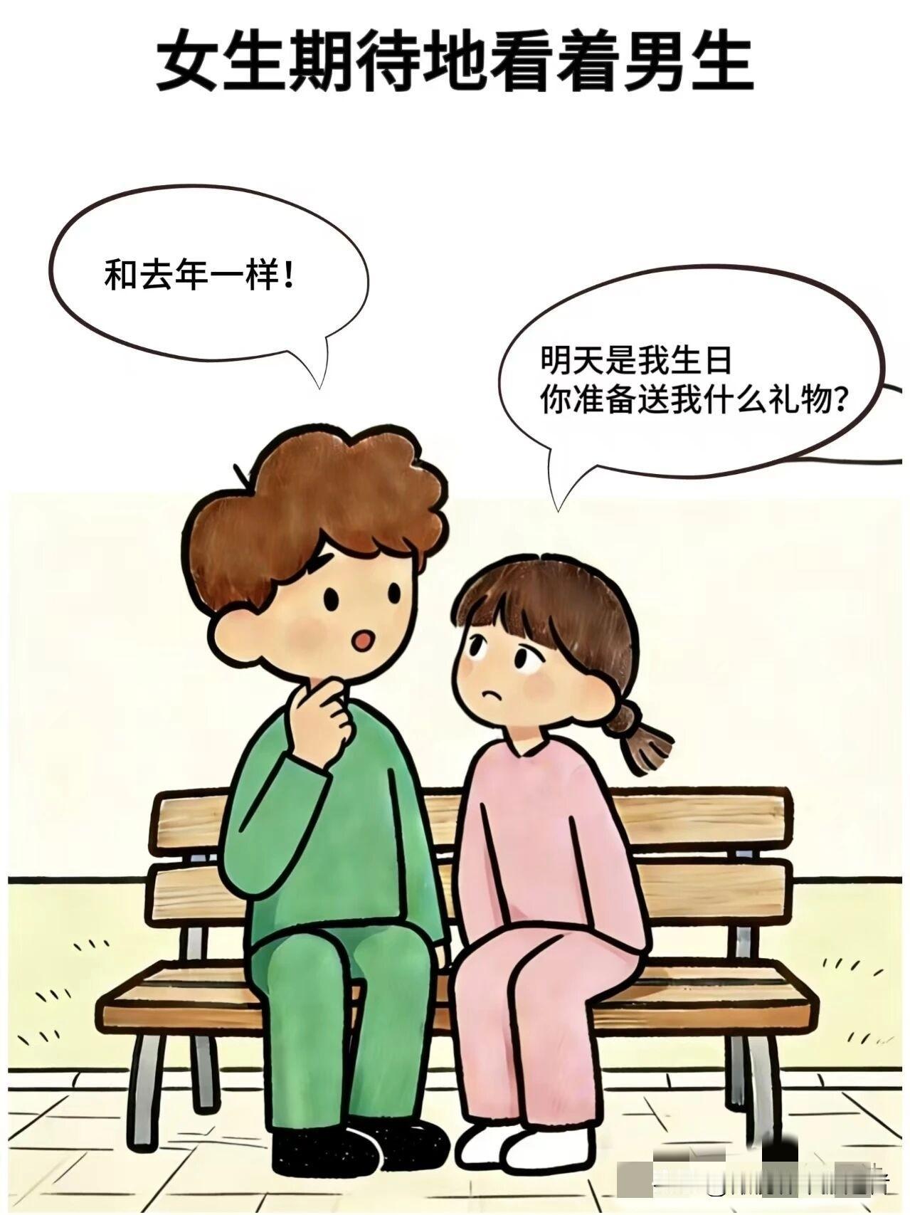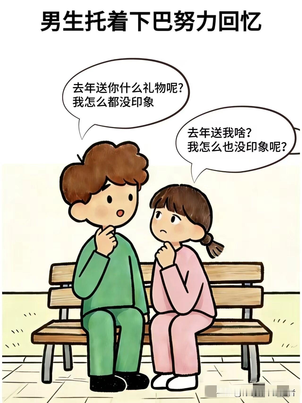 趣味漫画:女生:明天是我生日,你准备送我什么礼物,男生:和去年一样,女生:去年你送我什么?男生:去年送你什么,一点印象都没有