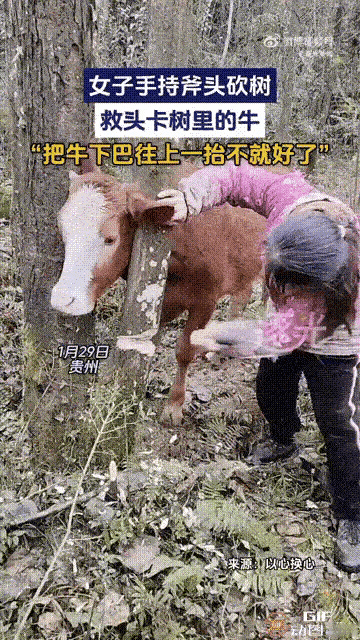 我真服了,怎么就不懂得变通?贵州一名女子在山上放牛,期间牛的头不慎卡进了两棵树之间的缝隙,于是女子直接拿来了斧头,用力地砍树,准备把牛救出去。 最后女子砍断了一棵树,救出了牛。 网友看完这段视频,都觉得这名女子的做法,实在是太让人感到无语了。 这头牛的头不慎卡进了两棵树之间的缝隙,对于牛来说,它或许不会思考,所以不懂得如何自救,但对于人来说,这件事明明有一个非常简单的方法能够救出牛。那就是,把牛的下巴往上抬一些。 因为两棵树之间的缝隙,明显是越往上越宽的,牛的头之所以会卡进去,也是从上面伸进去的,所以要想把牛救出来,只要把牛的下巴往上抬,就可以成功脱困了。 可是这名女子却没有想到这个办法,甚至不惜拿来斧头砍树,这种做法真是耗时耗力,真不是明智之举,可见遇到事情一定要多思考,否则只是做无用功而已。 视频里女子挥着斧头砍得满头大汗,树都快被砍断了,牛还在原地哼哼,换谁看了都得着急。明眼人一眼就能看出来,那树缝上宽下窄,牛脑袋能伸进去,往上抬肯定能出来,费那劲砍树干啥?别说省时间了,砍树还容易伤着牛,万一树倒下来砸到自己也不划算。 这事儿说白了就是脑子转不过弯,遇事光想着蛮干,不想着找简单办法。生活里这种情况也不少见,有的人遇到问题就死磕一个办法,明明换个思路就能解决,偏要钻牛角尖。 其实很多时候,不是事情有多难,而是我们太执着于自己的第一反应,忘了变通。遇到事儿先停一停,多观察多琢磨,往往能少走很多弯路。各位读者你们怎么看?欢迎在评论区讨论。
