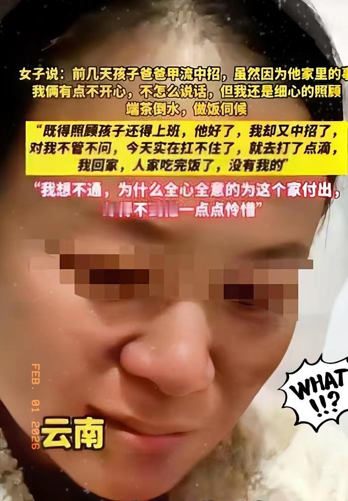 云南一女子发视频抱怨自己的丈夫,出去喝酒竟忘了去幼儿园接自己的儿子,两口子为此事大吵一顿,彼此冷战中,她丈夫又感染了甲流,虽然两个人还没有和好,但女子看丈夫生病痛苦的样子,还是于心不忍,就开始细心照顾起自己的丈夫,端茶倒水,洗衣做饭。 女子的包容从不是理所应当,而是藏着对家的珍惜,可她的真心,却喂不饱一个自私的人。丈夫痊愈后,女子被感染,拖着病体上班带娃,丈夫却只想着躲着自保,连一句关心都没有。就连她去医院打点滴,叮嘱做顿饭,回家只剩丈夫吃完的外卖,连一口热饭都没留,这哪里是夫妻,分明是把妻子的付出当成了免费的保姆式服务。 婚姻里最寒心的从不是吵架冷战,而是我为你雪中送炭,你却对我雪上加霜。女子的委屈,戳中了太多在婚姻里独自付出的人,好的婚姻从不是一个人的独角戏,而是彼此的体谅和双向的奔赴,一味的迁就和付出,换来的只会是变本加厉的忽视。 你觉得在婚姻里,一味的包容和付出,真的能捂热一颗冰冷的心吗?