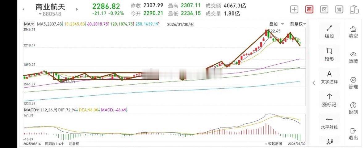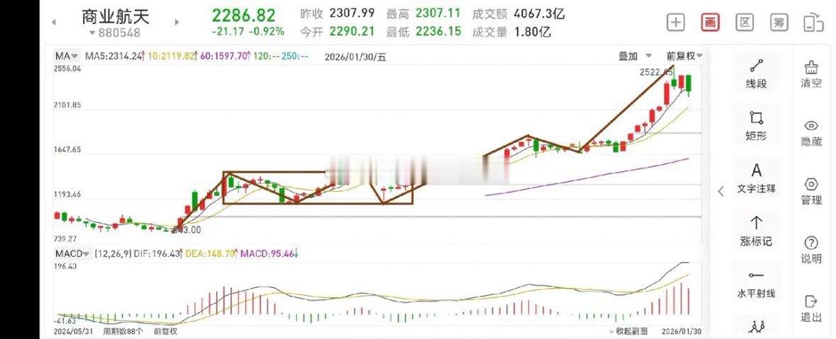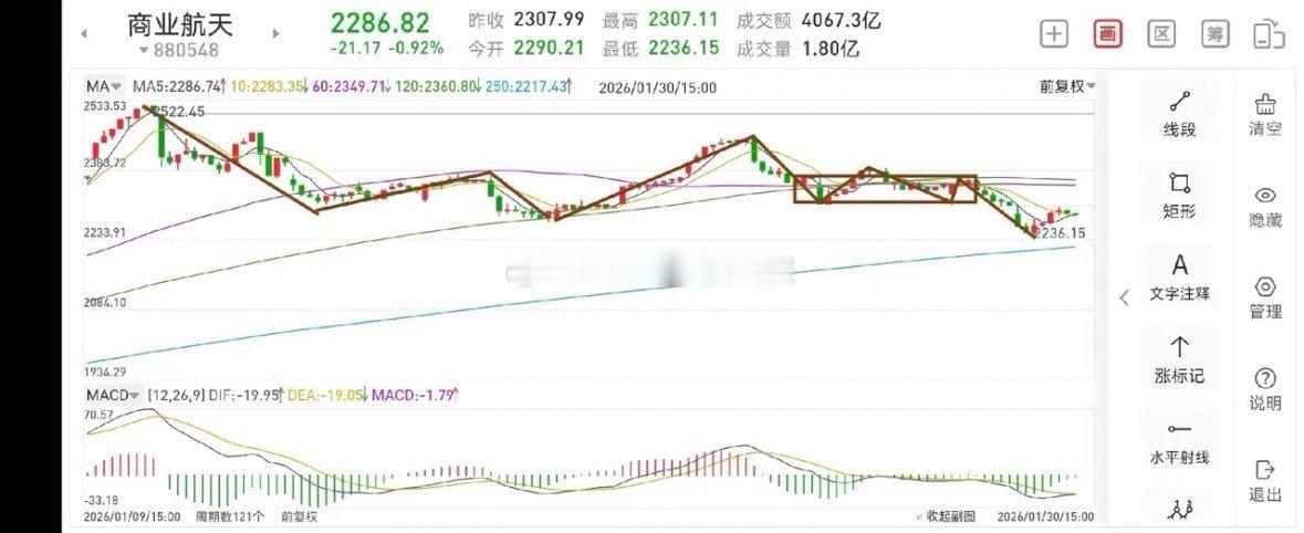 聊聊商业航天板块(2026.2.1)商业航天板块在经过前期的一段上涨后,目前处于窄幅震荡调整过程中,待调整完成后,还将进一步向上攀升,人民日报曾发文,2026年是航天大年,所以该板块后期走势是可期的。1.从周线图一上看,前期的上涨暂时告一段落,现在正在构建第二个周线上涨中枢,该中枢及有可能走9笔日线,目前已经完成三笔,这里的操作级别是30分钟,意思是说,如果你想在这个区间高抛低吸,可以按30分钟乃至5分钟上去找买卖点。2.从日线图二上看,目前走了三笔日线,从前三笔完成情况来看,大致震荡区间的下沿就在周五的低点附近,也就是说,这里只有向上的震幅,向下的空间已经很窄了。3.从30分钟图三上看,如果你想做高抛低吸,只要站上最后一个中枢上沿并回踩不破新低的时候便可进行低吸。高抛点最好选择5分钟上的卖点进行高抛,意思是说,只要5分钟走坏,就要把加的仓位退出来。总体而言,该板块无忧。临近春节,各个板块总体都是一个区间震荡,不会出现大的行情。航空航天板块股票复盘应该关注哪些方面记录我的2026