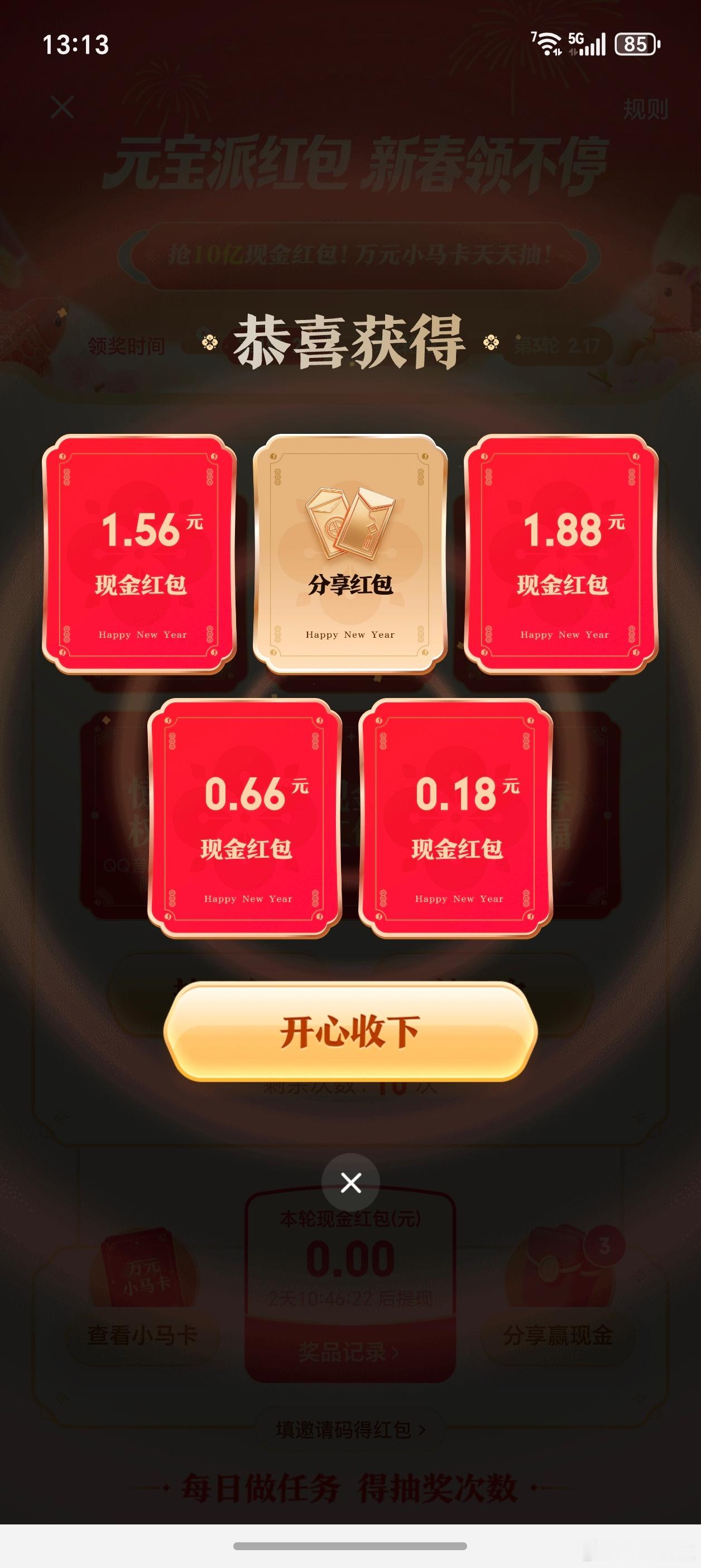 元宝红包领了5块,刚点了一杯瑞幸苹果美式特大杯花了18,负账13块,不玩了主要