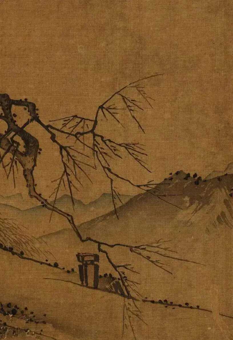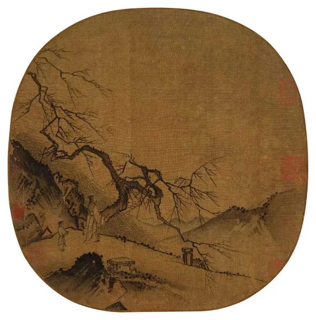 南宋 佚名《高士观梅图》29×28.5cm。画面左上角山岩如刀削,一株老梅斜着身子探出来,花苞开得端庄。高士拄杖观梅,身后青草漫坡,远处山峦叠成水墨色,颇具马远风格。这就是中国风遇见艺术