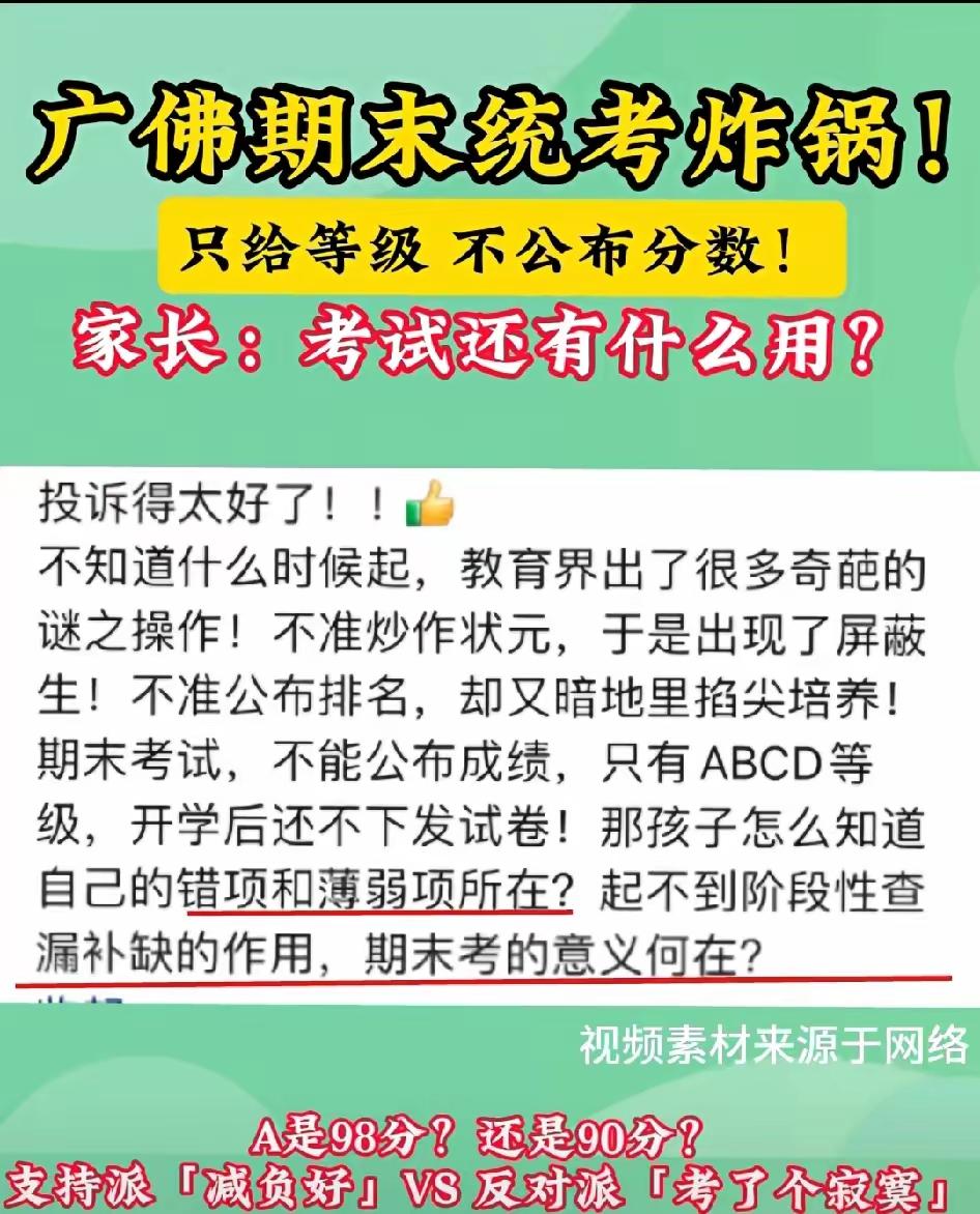 外省的初中、小学不知道什么情况,广东初中、小学期末考结束了,小孩成绩只能看等级abcd等级,看不到具体的分数!小孩的分数变成了国家机密?! 表面上是说为了给小孩减轻压力,让他们寒假可以开心愉快的玩,但是其实小孩、家长看到了这个等级,更多的是猜测、疑问,哪里还有开心愉悦感!? 因为在我们中国喊了几十年的素质教育,最后的结局还是应试教育,中考能不能上到重点高中、普通高中,还是要看具体的分数,还是要看年段的排名,又不是看abcd! 有本事中考也这样子,用abcd来招生录取?! 教育系统的管理者是出于什么想法呢?其实这个不单是不能让小孩开心,还让家长焦虑,让小孩更加迷茫。其实具体的成绩多少,春节假期结束开学后公布跟现在公布有什么区别,现在公布了,知道自己小孩哪一科相对差一点,寒假还可以多少适当的补一下,补缺补漏,知道自己的缺点!扬长避短。 因为这个结果已经出来了,迟早都要面对的,拖一个月公布有什么意义呢? 我看我小孩的成绩是a+,我知道大概是排名前20%,但是究竟分数具体多少呢就不知道了,究竟能考到怎样的高中也不知道,带给我没有任何开心、愉悦感,带给我的是压力,我又要去找关系去查成绩,他们说年段长知道成绩,他们说校领导知道成绩,他们说教育局的领导也知道成绩,那不是给家长制造压力吗?要去找关系,查成绩?! 也就是说,有关系的人可以查到具体的分数,没有关系的人只能等待,难道又是搞权力寻租?! 当然,这是我个人家长的意见,也许很多家长愿意以abcd代表成绩!最关键中考不是abcd来录取,还是具体的分数!这才是核心,这才是重中之重。 哪一个家长没有压力?像顺德中考只有40%的人上高中学校的机会,剩下60%要分流到上职业高中、上中专,你说这个压力大不大?! 其实学校也有压力,为什么现在各个学校还是分重点班、平行班、普通班。拿我们顺德一中最好的高中一样,分重点班、平行班、普通班,重点班的人,中考结束不到一个月,比普通高中提前一个月就开学了。 平时每个高中里面也是一样,重点班的人教育资源不一样,补课时段也不一样,连开家长会都分开来开。 现实是非常残酷的,竞争是非常惨烈的! (图片来源网络。若有侵权,请联系删除)