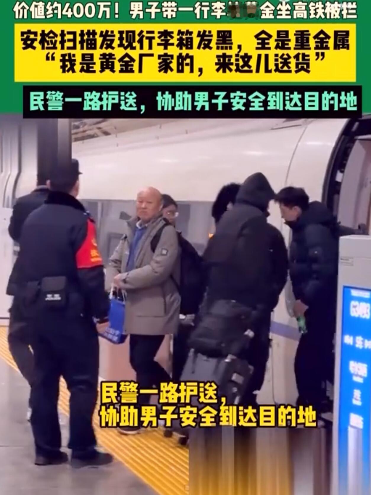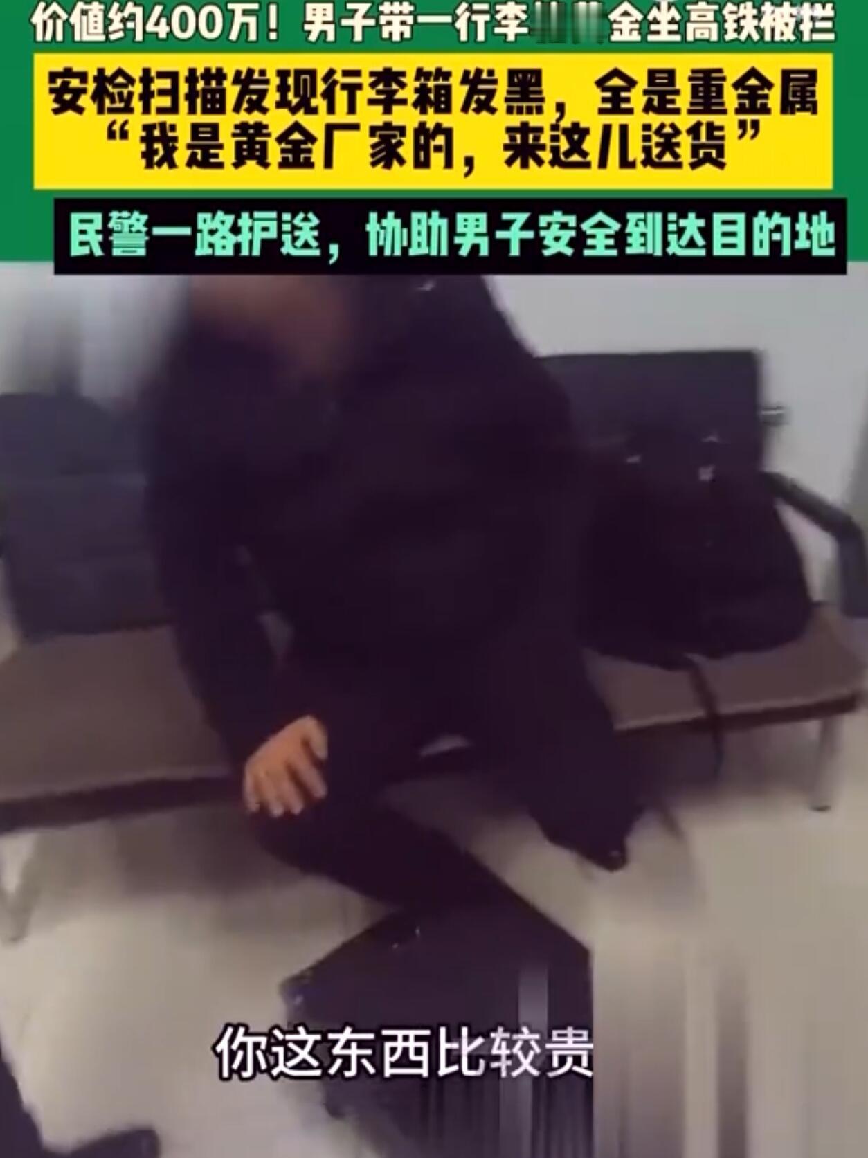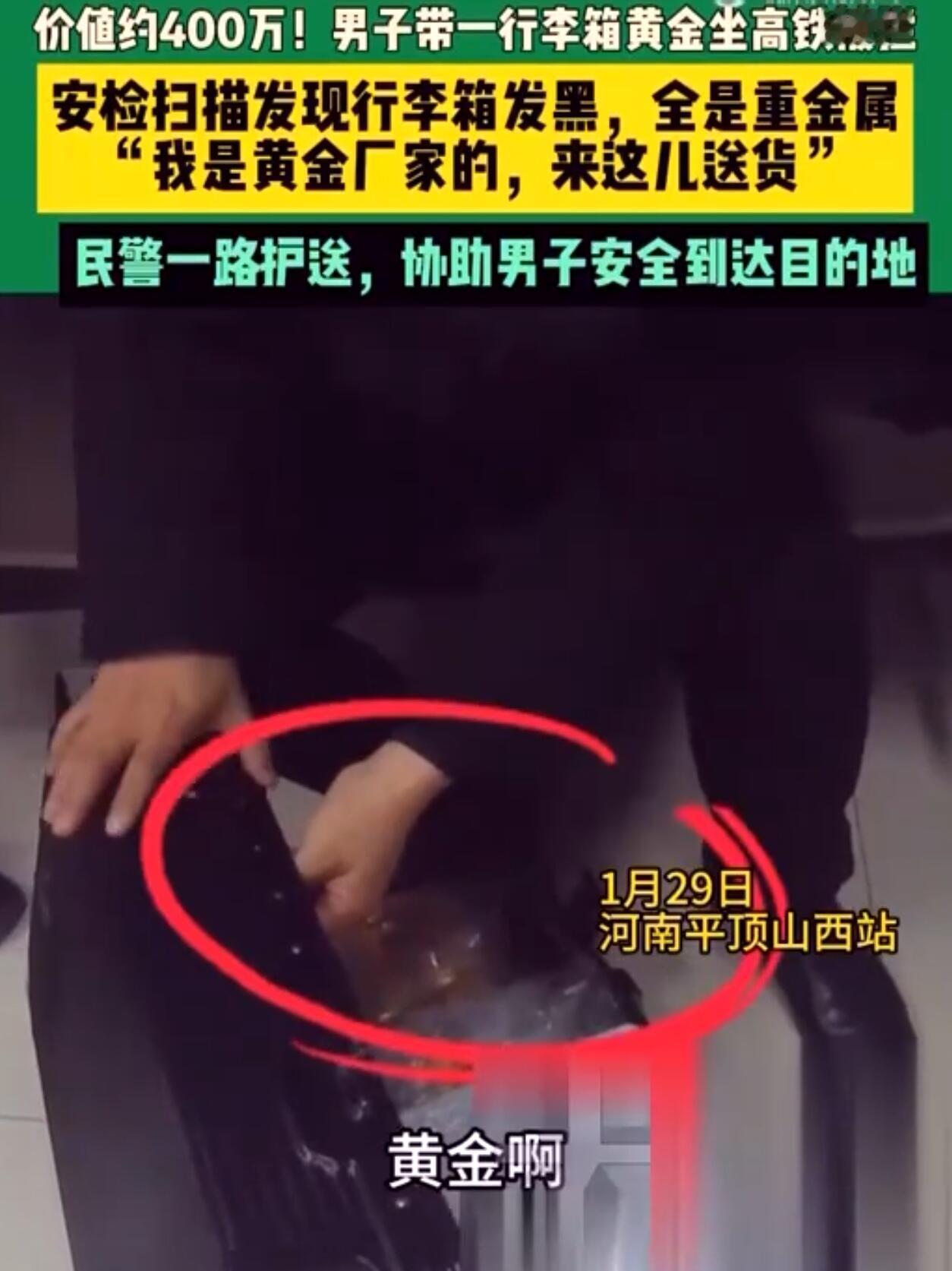 河南平顶山西站最近出了件挺抓马的事。高铁安检口,一个男的拖着行李箱过安检,机器一扫,屏幕上黑乎乎一片。安检员一看就紧张了——这架势,箱子里怕不是装满了金属。 没含糊,安检员马上报警。警察很快就来了,拦下男子一问,人家赶紧解释,说自己是做黄金生意的,里头全是金首饰,总价四百多万,这次是坐高铁去湖北襄阳送货。 警察开箱一查,还真是满满一箱子黄金。虽然最后证明是虚惊一场,但现场气氛那会儿是真紧张。 这事儿上了网,网友都来劲了。有的说这哥们心真大,四百多万的货就敢拖着坐高铁,万一路上有个闪失,哭都来不及。也有人觉得,人家手续齐全,爱怎么走是人家的自由,没必要大惊小怪。还有人开玩笑,说这箱子要是在安检机上卡住了或者摔了,赔起来可有的扯了。 要我说,这事两边都有理。从安全和个人选择看,他手续合法,东西是自己的,选高铁运输好像也没毛病,总不能因为东西贵就不让上高铁吧。但话说回来,带着这么贵重的物品,风险确实不小。高铁毕竟是人流密集的公共交通,万一有个疏忽,或者被有心人盯上,那损失可就大了。他自己可能觉得方便,但这份“方便”背后的风险,是不是有点太高了? 安检员和警察的反应是绝对专业的,看到可疑情况立刻处理,这是对所有人负责。总之,东西是人家的,怎么带是他的自由,但咱们旁观者看来,这操作确实有点“虎”。
