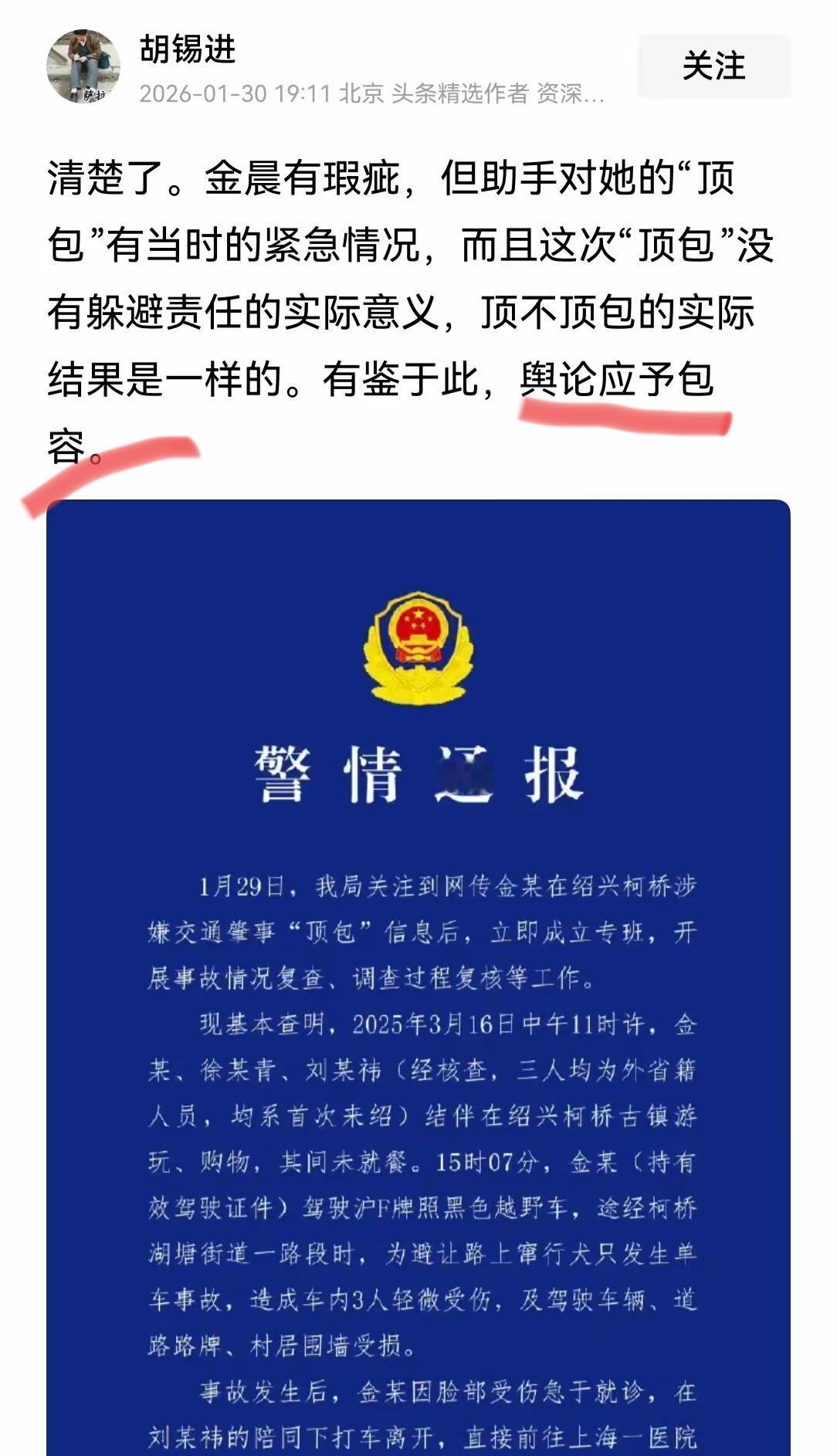 老胡又觉得自己行了,对牢A和斩杀线的热点闭口不言,被全网呼叫,才不痛不痒巴拉了几句,还拿沉默权说事! 估计是觉得风平浪静了,老胡蹦出来劝人们要对金晨包容,说顶不顶一个样,顶包也没躲避责任,这番言论着实让人看清了老胡的嘴脸,实在让人不敢苟同。顶与不顶,那性质能一样吗?顶包是助理向交警作虚假陈述,已然触犯《治安管理处罚法》,是扰乱行政执法秩序的违规行为,能是“没区别”的小事吗?而他说的所谓“没躲避责任”,不过是事后自费赔偿、公开致歉,可这份担责,是在顶包行为被曝光,舆论发酵后的被动选择,和事发之初的主动担当,两者的性质与诚意,有差天渊之别吧! 老胡的逻辑是,抽老胡一个大嘴巴,发现抽错了,赶紧给他道歉,他会包容的,大家可以都去试试!