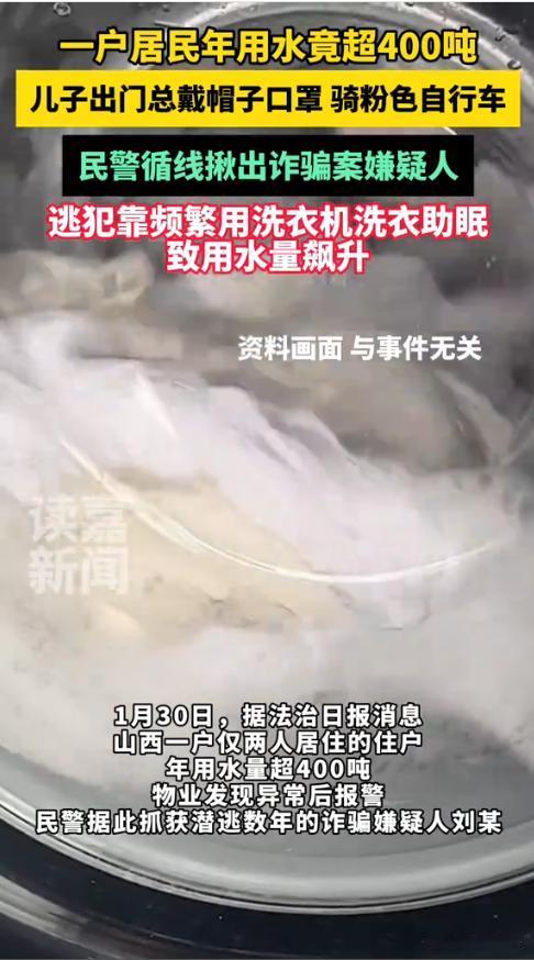 “细思极恐!”近日,山西,一小区的物业公司发现一户仅两位老人居住的家庭,一年用水量竟高达400多吨,远超正常家庭数倍。而党工工作人员上门排查漏水时,老人却坚称自家没问题,决不让水暖工进门,网友:这背后肯定藏着事儿,绝对不简单! 按照城市居民生活用水的普遍标准,普通家庭每人每月的用水量通常在3-5吨左右,算下来两人居住的家庭,一年正常用水量大约在72-120吨。而这户家庭400多吨的用水量,已经是正常水平的3到5倍,如此悬殊的差距,让物业立刻意识到事有蹊跷。 据媒体1月31日报道,年底物业公司经过复盘时发现,一位老人家里的用水量竟达到了400多吨,而据负责人所知,老人家里只有两口人,这么大的用水量明显不正常。 物业担心是管道漏水,先后几次联系老人,提出上门检测的请求,但每次都被老人拒绝。有几次工作人员上门敲门时老人都在家,一听说要进屋检查,老人却死活都不让进门,这种情况,让物业感觉太过反常,于是选择了报警。 警察上门调查才发现,老人的儿子竟是一起诈骗案的在逃嫌疑人,原来这段时间一直躲在家里,难怪老人不让进。 当问及为什么用水量这么大时,才知道原来老人的儿子自从犯了事之后,就承受巨大心理压力。只能靠反复洗衣机洗衣服来缓解焦虑,有时甚至会把干净的衣服重新放进洗衣机清洗,洗衣机几乎每天都不停运转,才导致用水量飙升。 网友表示,人还是不能做亏心事,不然良心难安啊。这个物业还挺负责的,发现不对劲就报警了,误打误撞还立了一功。 信息来源:《俩人一年用掉400吨水拒绝物业上门警方介入发现逃犯》法治进行时