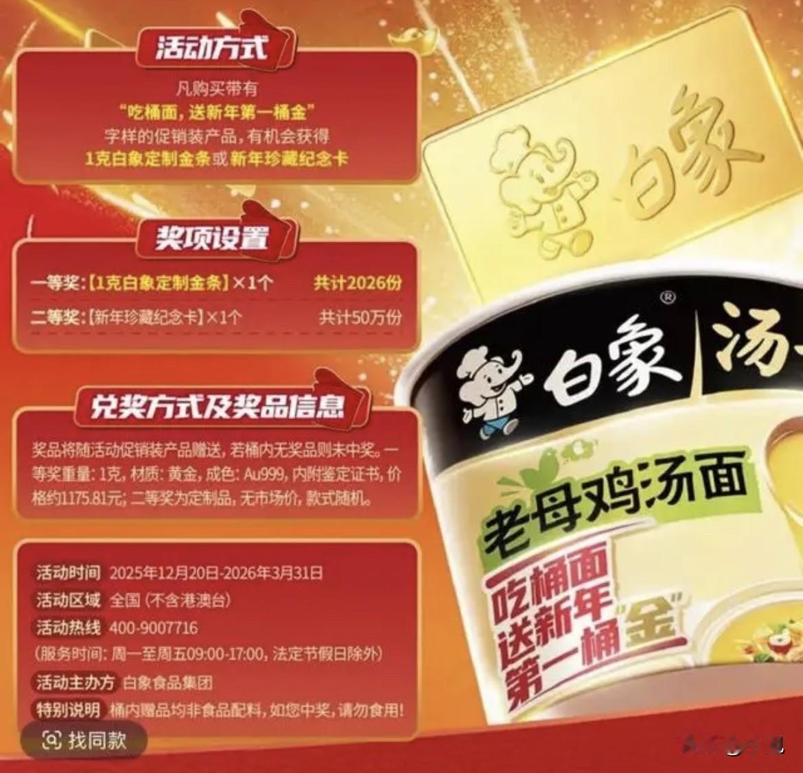 刷手机呢,又刷到一个。一女的,撕开泡面盖子,手指头碰着的不是叉子,是根金灿灿的小东西。刻着“白象”俩字,1克重。 河南的马女士,跟闺蜜去开封玩,下午四点多才到,饿得前胸贴后背。车站边生鲜超市里,别的牌子没有,她就拎了两桶白象的泡面,花了12块。打开其中一桶准备泡水的时候,金子就躺在面饼上。她说等金价涨涨就卖了,钱跟闺蜜一人一半。 视频一发,火了。7万多个赞。但你知道吗,她不是第一个。早十来天,安徽一位姚女士家的孩子,拆家里囤的泡面,也开出了金条。那孩子高兴坏了,他们家人压根不知道有这活动。姚女士选择留着,不卖,当个纪念。 事情一清楚,味儿就有点变了。白象官方说,这是“吃桶面送一年第一桶‘金’”的活动。从去年12月20号搞到今年3月31号。总共往全国撒了2026份1克的金条,是足金的,还带鉴定证书。值多少钱呢?按他们自己的说法,大概1175块多。 可客服也说,因为不知道总共生产了多少桶,没法算中奖概率。这话听着,就留了巨大的想象空间。 于是,超市里、快递站里,泡面不再是泡面了。它成了一个金灿灿的盲盒。好多人买它,心思早不在吃上了。网上到处是攻略:有人把整箱面抱回家,一桶一桶上电子秤称,专挑重的开。结果呢,有个哥们发现最重的那桶,金子没有,倒是多塞了好几把叉子。更绝的,有人直接上金属探测仪,在堆成小山的泡面前扫来扫去。连白象官方都忍不住出来劝:不建议这样啊,这玩的就是个随机惊喜。 惊喜没来,怀疑倒先来了。有人收到网购的泡面,发现纸箱有破洞,桶身也有损伤。脑子里第一个念头就是:我的金子,是不是已经被人摸走了? 这背后,是一笔挺明白的账。对品牌来说,这叫“情绪价值”。金价前段时间还在高点,一克黄金能买几百桶泡面。他们用一份千把块的金子,买一个热搜,买全网几百万的讨论度,买直播间里火箭一样往上窜的销量——有数据显示,一个参与活动的泡面链接,就卖出了上百万桶。太划算了。 对我们来说呢?花几块钱,买一个“万一呢”的盼头。这盼头让枯燥的宵夜有了探险的意味,让普通的消费带上了彩票的色彩。你知道大概率是拆出一顿酸菜牛肉面,但又忍不住想,万一底下压着的,是能换钱的硬通货呢? 这事的魔力就在这儿。它把两种最踏实的东西——填饱肚子的食物、保值的黄金——用最虚浮的“运气”串联起来。我们一边嘲笑那些拿着金属探测仪的人魔怔,一边自己下单时,心里也悄悄动了一下。 所以,你看这像不像个现代寓言?我们都在用自己的方式,试图从生活的泡面桶里,捞出那根未必存在的金条。 这事儿你怎么看?你愿意为这份“万一”的惊喜,去买一桶计划外的泡面吗?
