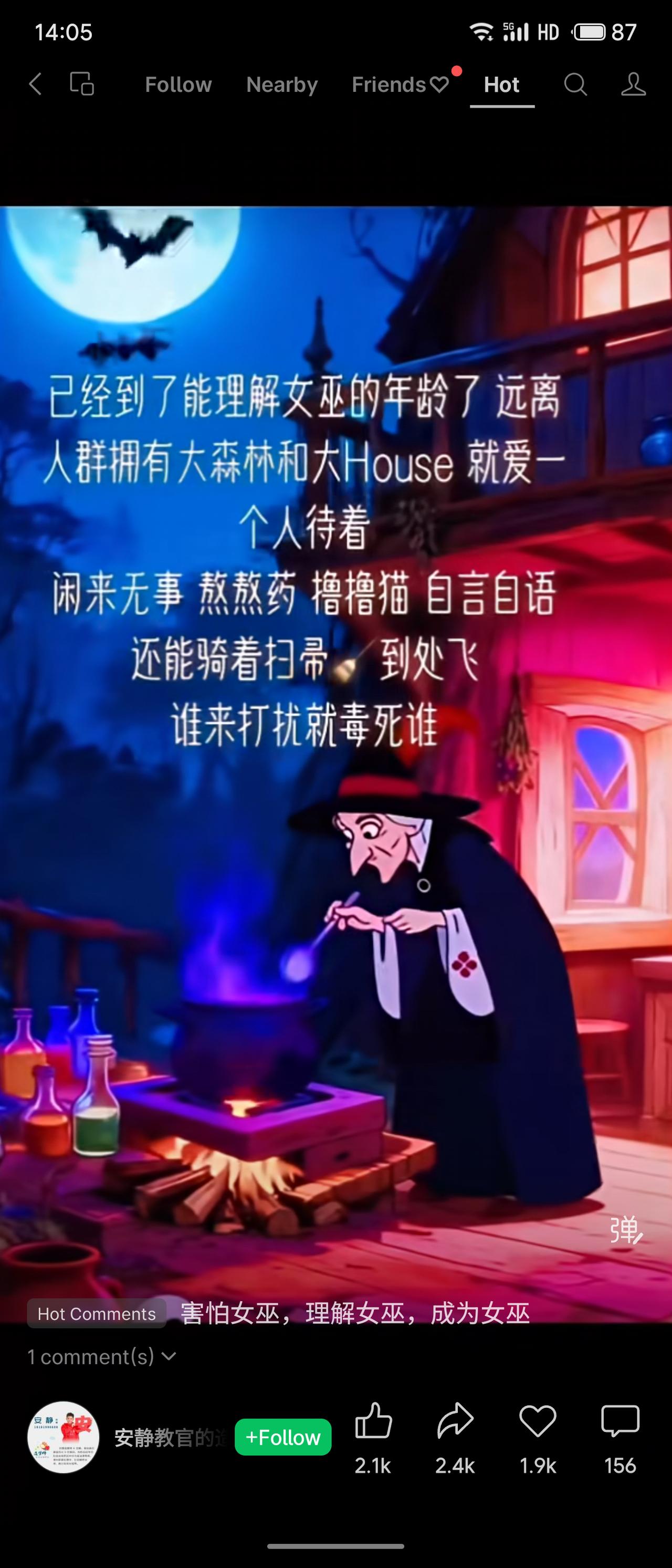 以幽默口吻描述理想生活:远离人群,独居森林大房子,熬药、撸猫、骑扫帚,享受自在。热门评论“害怕女巫,理解女巫,成为女巫”折射出部分现代人对疏离与独处生活的共鸣。