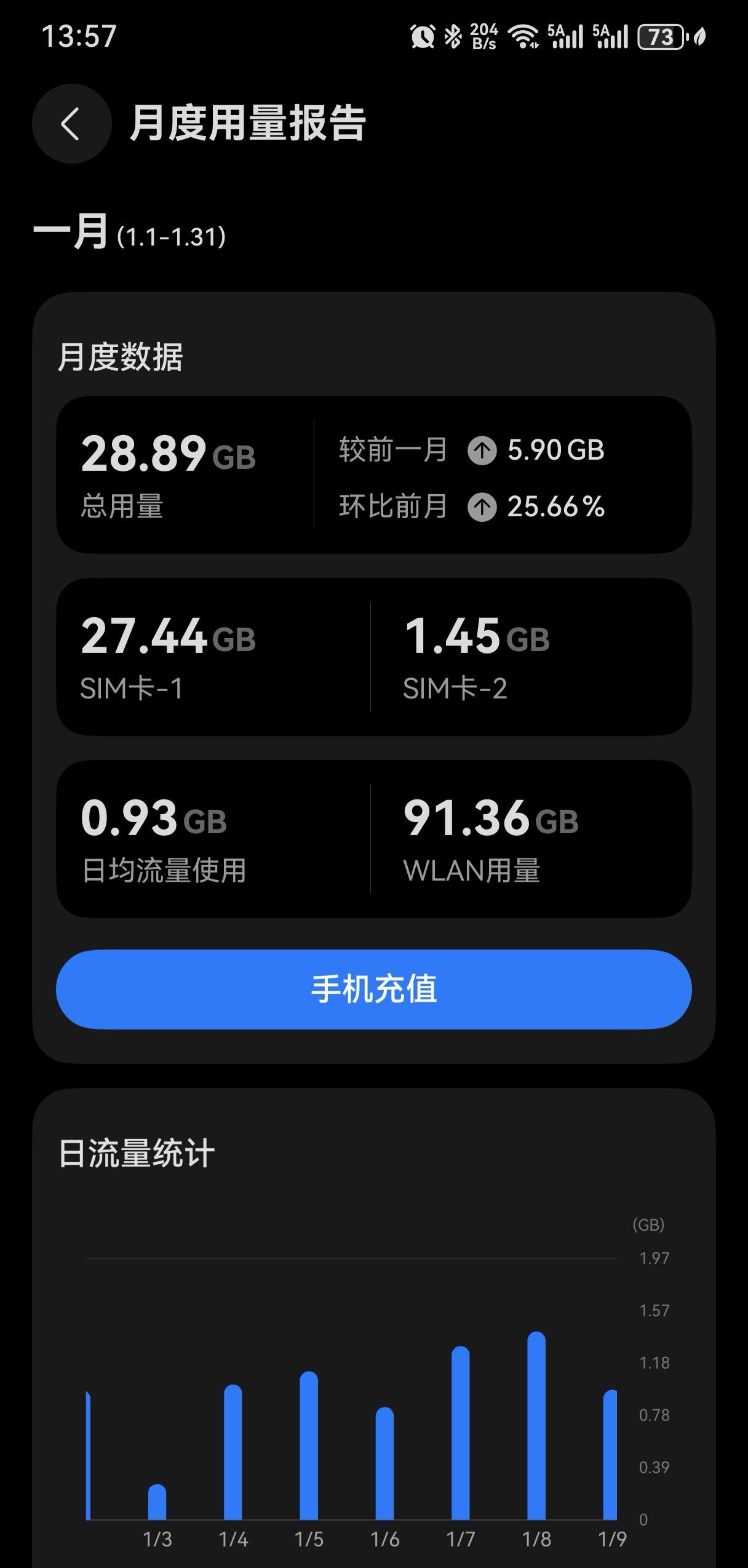 华为手机的负一屏终于有用了。 以前觉得手机的负一屏没有啥用处,可能是没用好。 其实,华为手机的负一屏内容可以根据需要,自己设置的。 终于第1次知道,我的2张手机卡和Wi-Fi每个月各用了多少流量。 我的手机卡1是广电卡,套餐有 100GB流量,剩余很多。手机卡2是中国移动的8元保号套餐,上个月送了2GB流量。