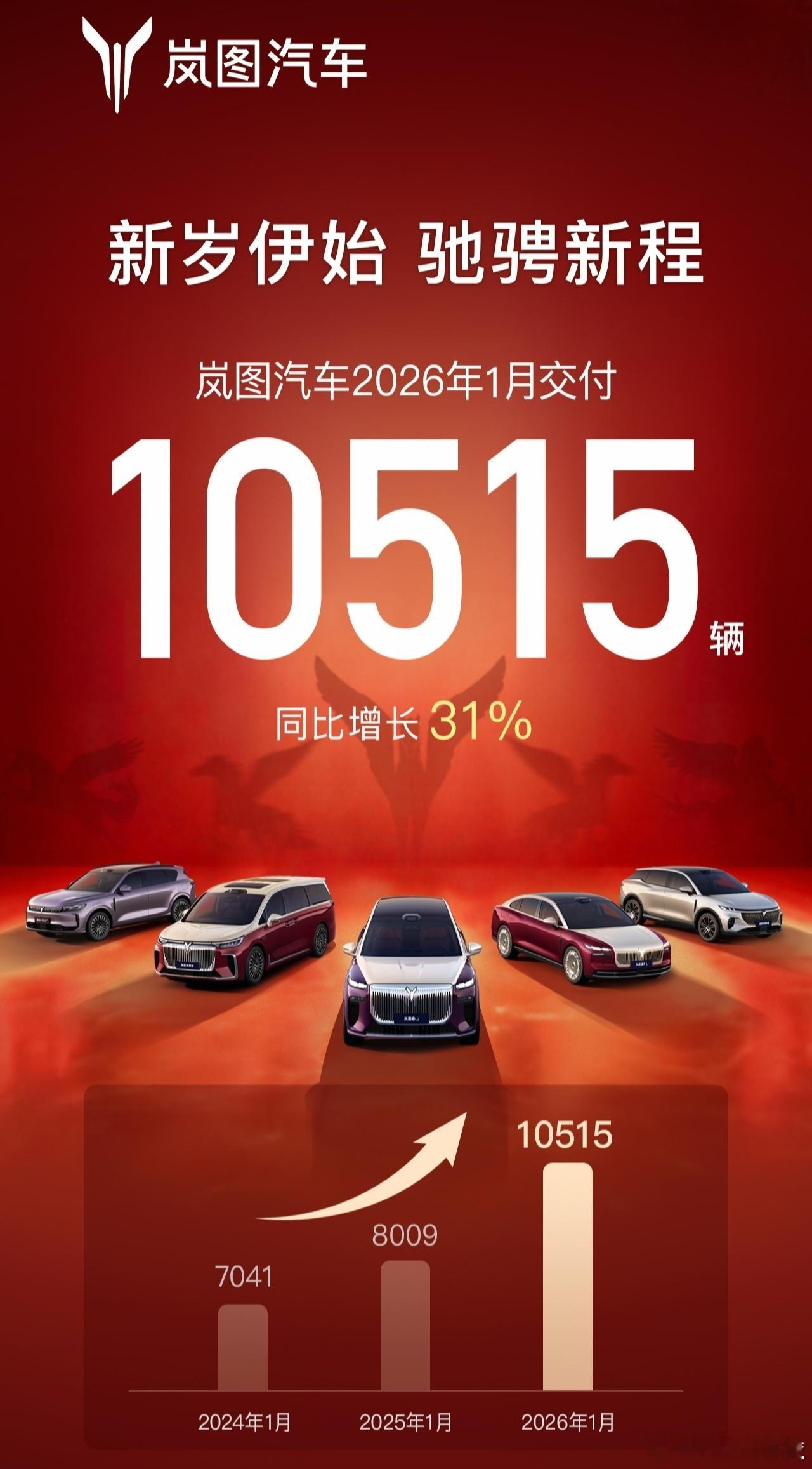 岚图汽车1月交付量超过了1万台,同比也有显著增长。岚图目前整体的高端化之路还是走的挺稳的,新出的高端车型都有不错的市场认可度。2026年还会有4款重磅的新车,期待一下岚图汽车