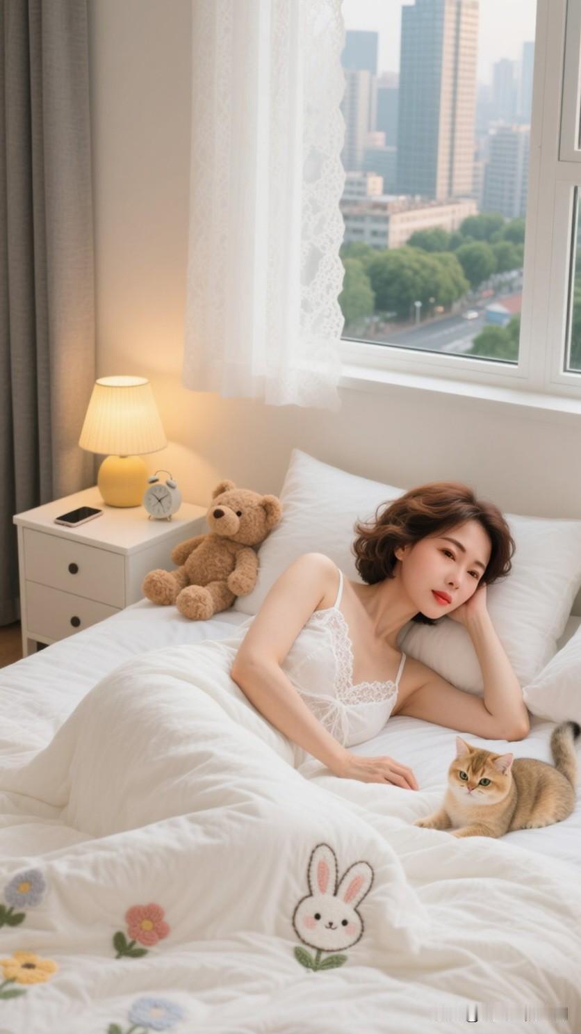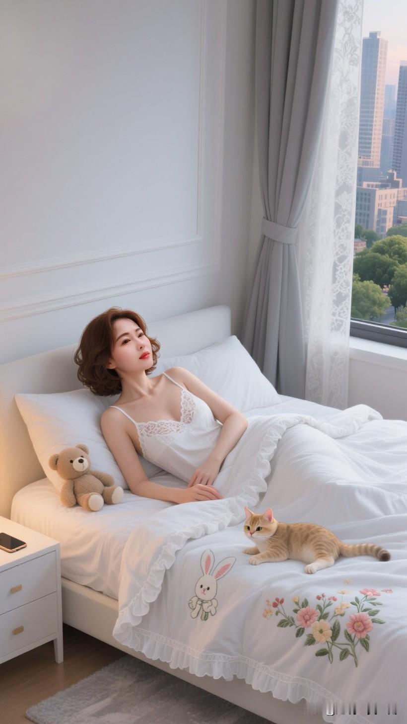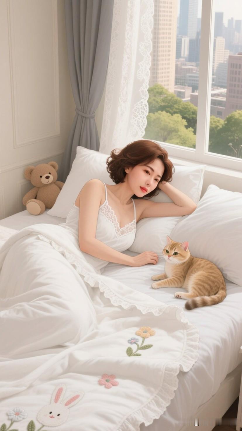 春日午后,阳光透过轻薄的纱帘,温柔地倾洒在卧室之中。一位身着洁白精美睡衣的佳人,正悠然地蜷缩在柔软的大床上。她的身旁,一只毛绒绒的猫咪正舒舒服服地打着盹。 佳人那白皙如玉的肌肤,配上苗条身姿所呈现出的优美睡姿,令人浮想联翩。她凝望着空中,沉浸在这静谧的氛围里。她时不时轻抚猫咪的脑袋,猫咪也会偶尔伸个懒腰,用脑袋蹭蹭她的手。 窗外微风轻拂,室内温暖而宁静。这样的时光,没有工作的压力,没有生活的繁杂,只有暖阳、猫咪和自己。真希望时间能就此定格,让这份慵懒与美好绵延不绝。
