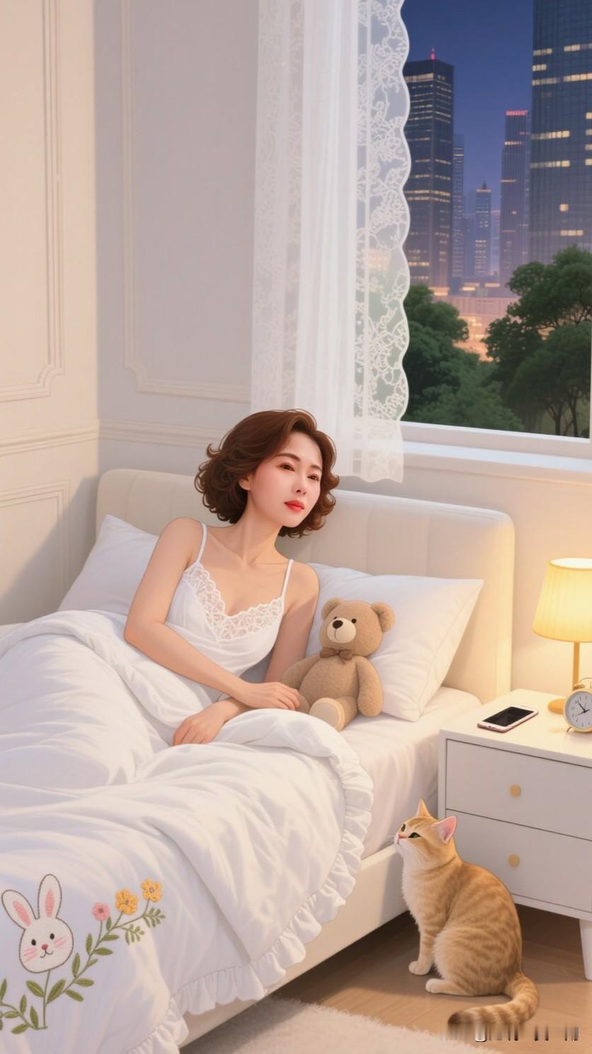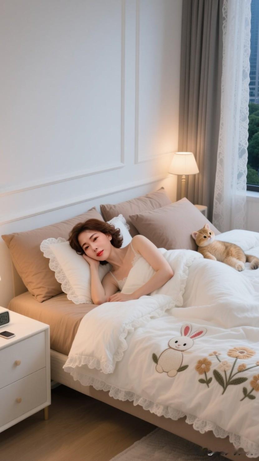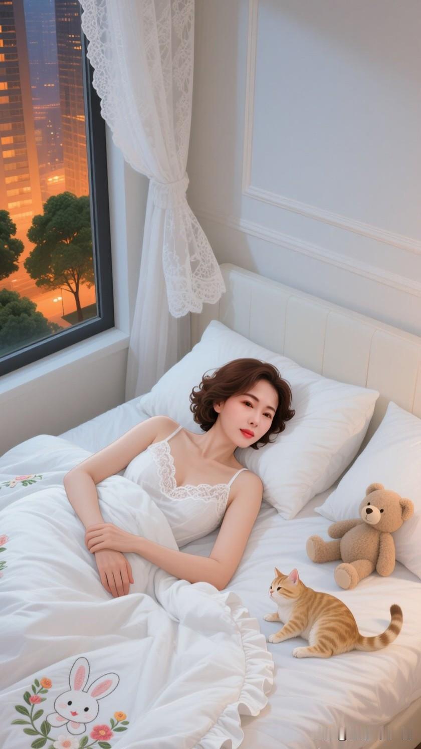 春日午后,阳光透过轻薄的纱帘,温柔地倾洒在卧室之中。一位身着洁白精美睡衣的佳人,正悠然地蜷缩在柔软的大床上。她的身旁,一只毛绒绒的猫咪正舒舒服服地打着盹。 佳人那白皙如玉的肌肤,配上苗条身姿所呈现出的优美睡姿,令人浮想联翩。她凝望着空中,沉浸在这静谧的氛围里。她时不时轻抚猫咪的脑袋,猫咪也会偶尔伸个懒腰,用脑袋蹭蹭她的手。 窗外微风轻拂,室内温暖而宁静。这样的时光,没有工作的压力,没有生活的繁杂,只有暖阳、猫咪和自己。真希望时间能就此定格,让这份慵懒与美好绵延不绝。