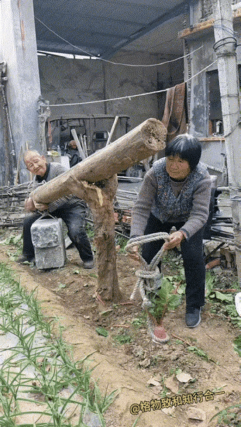 大爷大妈的物理没有白学,杠杆原理学得好,理论联系实际,既锻炼身体又把萝卜拔出来了,活也干了,一举三得,了不起。