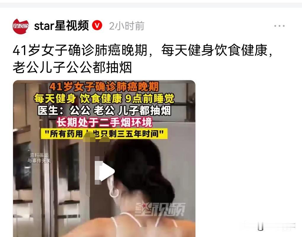 不抽烟的女人最好找一个不抽烟的男人,因为吸烟太影响健康了,吸二手烟的危害也是相当的大。 2月1日(发布)。 河南郑州,41岁的高颜值女子,每天健康饮食没有任何不良习惯。 但是她的老公、儿子、公公都抽烟。 这导致她长期处于吸二手烟的状态。 这抽烟的没得癌,她倒得了,吸二手烟的危害比吸烟的还大。 所以不抽烟的女人最好是找一个不抽烟的男人。 医生说所有药用上也只有三五年的时间了。 这真是悲剧了。