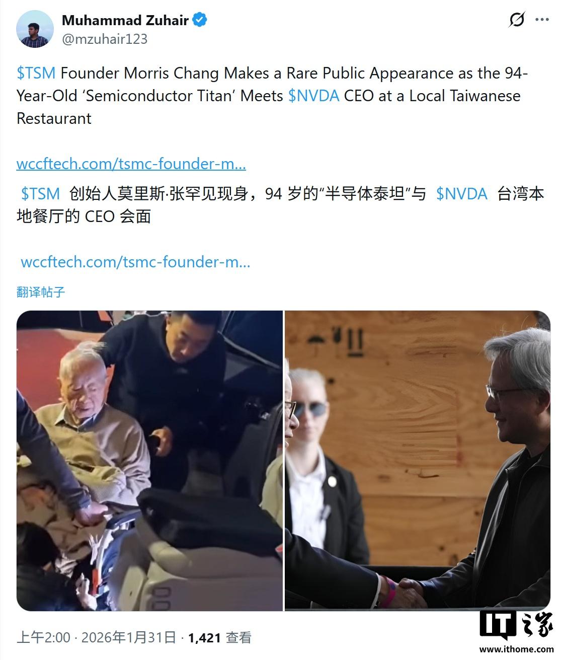 IT之家 1 月 31 日消息,科技媒体 Wccftech 昨日(1 月 30 日)发布博文,报道称英伟达 CEO 黄仁勋在台北某餐厅,与 94 岁高龄的台积电创始人张忠谋会面。 要知道黄仁勋和张忠谋,那可不是一般的合作关系,是张忠谋在英伟达快倒闭的时候,拉了黄仁勋一把,才有了今天的英伟达。 早在上世纪90年代末,英伟达刚成立没几年,穷得叮当响,五六十个员工挤在一间小办公室里,搞出来一款游戏芯片,可找遍了代工厂家,没人愿意接活儿——那时候英伟达没名气,订单量小,谁也不想冒风险。 黄仁勋走投无路,硬着头皮给张忠谋写了一封求助信。 那时候台积电年营收都超10亿美元了,张忠谋是半导体圈的大拿,哪有功夫搭理一个快破产的小公司?换做一般人,这封信估计直接扔垃圾桶了。 可张忠谋不一样,他不仅看了信,还亲自飞到美国加州见黄仁勋。见面的时候,黄仁勋坦言公司快撑不下去了,但拍着胸脯说,这款芯片能救英伟达,以后肯定能成为台积电的大客户。 这话在当时听着,跟吹牛皮没啥区别。 可张忠谋偏偏信了,他不是瞎信,是看透了一个趋势:以后芯片行业会分成设计和制造两拨,专门搞设计、不建工厂的公司,肯定会越来越多。 他赌的不是黄仁勋这个人,是整个行业的未来。结果呢?这款游戏芯片一上市就爆火,英伟达一下子活了过来,短短两三年就成了台积电的前五大客户,俩人的合作一续就是几十年。 后来台积电遇到危机,还是张忠谋出手稳住了局面。 说到底,张忠谋这辈子,最牛的不是搞出了多少先进芯片,而是开创了一种全新的商业模式——纯晶圆代工。 在他之前,全球的芯片公司都是自己设计、自己制造,比如英特尔,从芯片设计到生产,全靠自己,这种模式门槛高、投入大,小公司根本玩不起。 1987年,56岁的张忠谋从美国回来,在台湾创办台积电,提出只做代工,不搞设计,不跟客户抢生意。 那时候没人看好他,觉得他这是自寻死路——没有自己的芯片产品,只靠给别人代工,能有啥前途? 可张忠谋不管这些,他知道自己的优势在哪。 为了站稳脚跟,他只能接别人看不上的“剩菜订单”,比如英特尔的微控制器芯片。 当时英特尔的主力产品CPU都是自己生产,只有微控制器这种非核心产品需要找代工,而且要求特别严,还让台积电照搬它的生产线。 台积电的高管都不同意,觉得这是受制于人,可张忠谋有自己的想法,他同意按照英特尔的标准生产,但坚持用自己的设备、自己的生产线,既能服务英特尔,也能接其他客户的订单。 就这么靠着过硬的品质,台积电通过了英特尔的认证,一下子在行业内打响了名气。有了英特尔这块金字招牌,其他公司也纷纷找上门来,台积电的订单越来越多,慢慢就把代工模式做成了行业主流。 这些年,面对美国的压力,张忠谋的表现也很有骨气。美国为了遏制中国半导体发展,逼着台积电把产能搬到美国,还要求台积电交出核心技术数据,甚至想让台积电把最先进的3纳米、2纳米制程优先在美国生产。 2020年,美国还逼着台积电停止给华为供货,台积电夹在中间,左右为难。 可张忠谋从来没盲从美国。 他早就说过,美国想在本土搞半导体制造,是“昂贵的徒劳”,成本比台湾高50%,而且缺乏熟练工程师,效率根本上不来。 事实也确实如此,台积电在美国亚利桑那州建的工厂,本来计划2024年量产,结果因为工人不够、供应链不成熟,一再推迟,到2025年才勉强试产,产能还远远达不到预期,工会还天天闹罢工,说台积电从台湾调工程师过来,抢了本地人的饭碗。 面对美国的施压,张忠谋始终坚守底线:台积电是一家商业公司,不是政治工具。 他虽然不得不遵从美国的禁令,暂停给华为供货,但一直没放弃中国大陆市场——毕竟中国大陆是全球最大的芯片消费市场,台积电不可能跟钱过不去。 而且他反复强调,最先进的技术必须留在台湾,美国厂不可能优先拿到尖端制程。这种清醒和坚守,在当下的地缘政治环境里,太不容易了。 现在张忠谋已经94岁了,身体大不如前,只能坐轮椅出行,可他还是关心台积电的发展,关心全球半导体行业的走向。 这次见黄仁勋,或许就是想看看自己一手扶持起来的“小弟”,也想给台积电的未来把把关。 毕竟,台积电是他一辈子的心血,是他从无到有、一手打造成的全球芯片巨头,现在全球近七成的高端芯片代工订单都在台积电手里,苹果、英伟达、高通这些巨头,都得看台积电的脸色。 总的来说,张忠谋这人,是真的厉害。 他有远见,能看透几十年后的行业趋势;有格局,能在危机时刻守住底线、善待员工;有骨气,面对外部压力不卑不亢,坚守商业本质。他不是神,也有决策失误的时候,但在半导体行业,能做到他这份上的,全球没几个。9 4岁坐轮椅见黄仁勋,不是落幕,更像是一种见证——见证他一辈子的坚守,见证他开创的时代,还在继续。