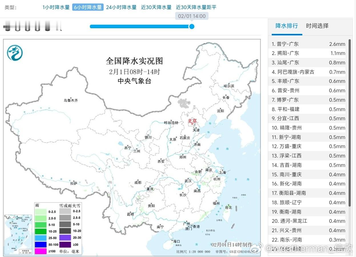 【晴天增多 降水减少】今天08-14时,我国降水稀少。6小时1毫米降水量就能排到前三,广东普宁2.6毫米排名第一。今天南方降雨缩减,但云量不少,还没彻底放晴。而华北一带随着小北风南下,空气变干燥。14时,北京和河北廊坊相对湿度不足20%,天津和石家庄不到30%。未来随着小北风继续南下,晴朗干燥的天气会从华北进一步向南扩展。