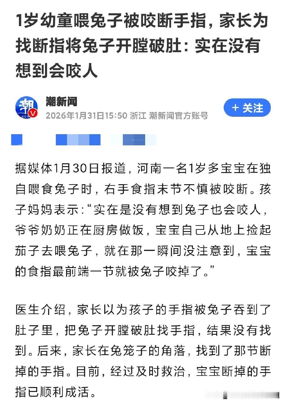 “小白兔白又白, 两只耳朵竖起来。 爱吃萝卜爱吃菜, 蹦蹦跳跳真可爱”。 童谣里温顺白兔, 竟也能引意外。 1月30日媒体报道, 河南1岁多宝宝, 拿茄子喂兔子, 右手食指末节被咬断。 及时救治,断指接上。 投喂动物伤孩子事不少, 多因孩子无辨别力、 家长没看好, 或场所防护警示没做好。 2023年3月, 北京怀柔2岁小孩园区喂兔, 右手指远端开放性骨折; 2025年8月, 广西平南7岁女孩摸虎, 小腿被咬伤,破皮还肿; 2015年3月, 石家庄11岁女孩喂狗, 鼻子被咬严重。 安全无小事, 看护宝宝责任重, 一不小心出大事! 提醒家长, 孩子喂动物时要在旁, 用工具喂,别用手; 若被咬伤,赶紧清创, 按暴露级别处理,留好证据。 (图片来自网络截图)