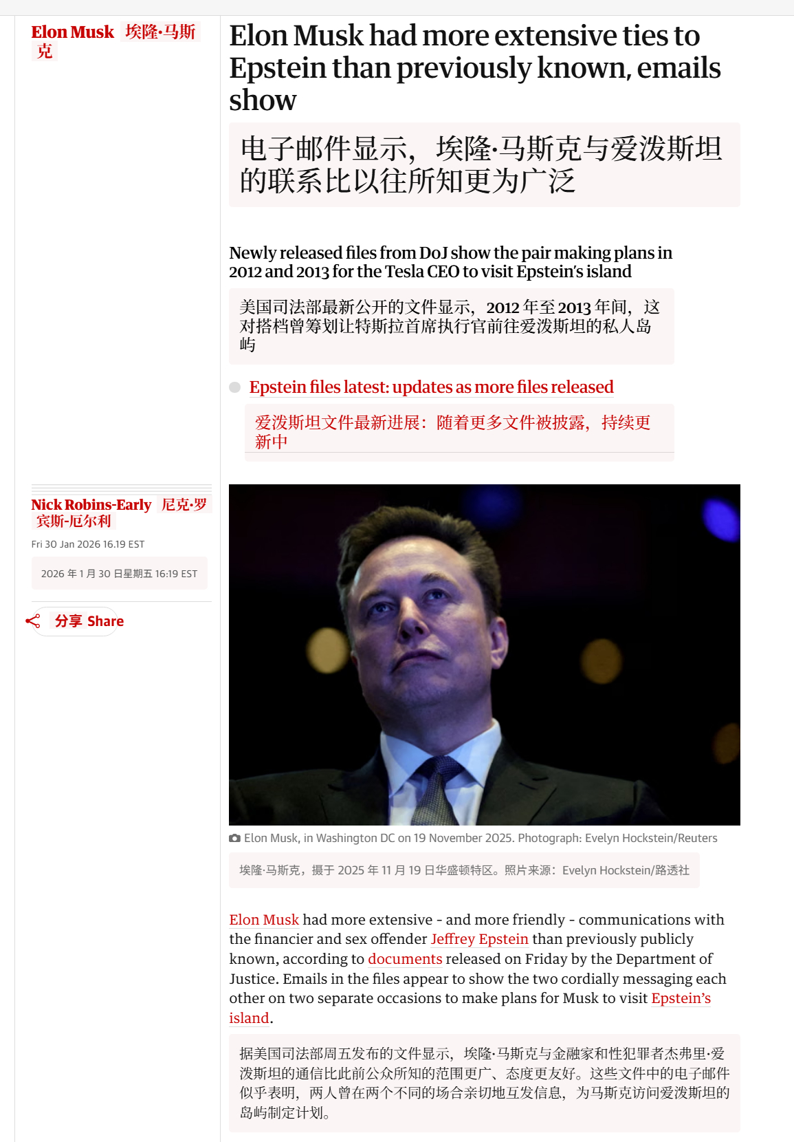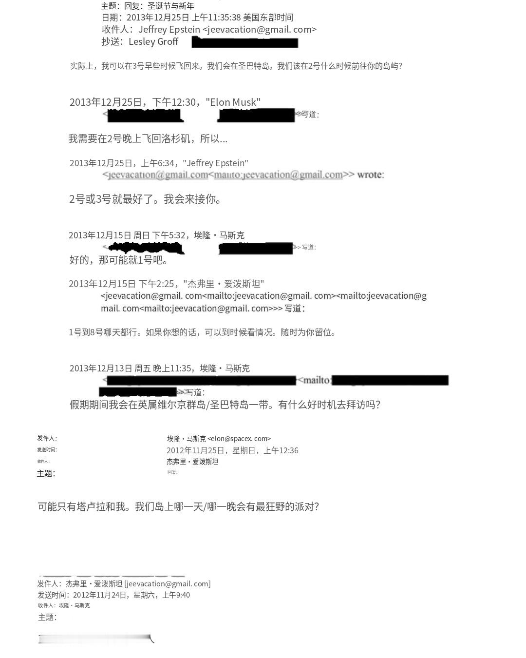 🔻据美国司法部周五发布的文件显示,马斯克与爱泼斯坦的通信比此前公众所知的范围更广、态度更友好。🔻这些文件中的电子邮件似乎表明,两人曾在两个不同的场合亲切地互发信息,为马斯克访问爱泼斯坦的岛屿制定计划。🔻这些文件包括 2012 年和 2013 年马斯克和爱泼斯坦之间的电子邮件,旨在确定马斯克何时应前往爱泼斯坦岛。由于后勤问题,这两次通信似乎都未能促成马斯克的访问。🔻“我假期期间会到英属维尔京群岛/圣巴特岛一带。有什么适合的拜访时间吗?”马斯克在 2013 年 12 月 13 日写道。🔻“1 号到 8 号之间任何一天都可以。如果你想,我们可以临时安排。随时为你预留空间,”爱泼斯坦回复道。🔻随后马斯克发了几封邮件告知其日程安排,两人最终将访问日期定在 1 月 2 日。这封邮件交流以爱泼斯坦告知马斯克自己需要留在纽约结束,他表达了因无法会面而感到遗憾。🔻“坏消息——不巧的是我的日程安排将让我必须留在纽约。我真的很期待最终能找时间相聚,只为尽兴一场。因此我感到非常失望。希望我们能在不久的将来另约时间,”爱泼斯坦写道。🔻2012 年 11 月,爱泼斯坦发给马斯克一封电子邮件询问“直升机会有多少人去岛上”。🔻“可能只有塔鲁拉和我。你的岛上哪一天/夜晚会有最疯狂的派对?”马斯克在回复中写道,显然是指他的前妻塔鲁拉·赖利。🔻马斯克在 12 月 25 日又回复了一封邮件,回应爱泼斯坦的另一条信息,后者鼓励他前去拜访,并提供了直升机供其使用。🔻“你们有任何派对计划吗?我今年一直工作到精神崩溃的边缘,所以一旦我的孩子们圣诞节后回家,我真的很想去圣巴特或其他地方的派对现场,好好放松一下。非常感谢你的邀请,但宁静的岛屿体验并不是我想要的,”马斯克写道。🔻“明白,我会在圣巴特见你,我岛上的男女比例可能会让塔鲁拉感到不适,”爱泼斯坦回应道。🔻马斯克说:“对塔鲁拉来说,比例根本不是问题。”🔻2013 年 1 月 2 日,马斯克在给爱泼斯坦发邮件时暗示不会赴约,称“这次的安排不合适”。🔻马斯克一直对和爱泼斯坦有关的人言辞激烈,但新公开的邮件似乎与他长期否认和爱泼斯坦有关的表态相左。🔻2019 年,马斯克在接受《名利场》杂志采访时曾表示,爱泼斯坦“显然是个怪胎”,并声称爱泼斯坦“多次让我去他的岛,但都被我拒绝了。”亿万富豪马斯克和爱泼斯坦的往来邮件是在 2008 年爱泼斯坦被判在佛罗里达州招嫖未成年人的数年后。2019 年,当局以联邦性交易罪逮捕了爱泼斯坦。🔻文件中的另一封邮件显示,爱泼斯坦的长期助理莱斯利·格罗夫似乎在 2013 年为爱泼斯坦安排了在 SpaceX 的午餐,邮件中写道:“埃隆·马斯克很感激前往牧场的邀请,但他有其他承诺……2 月 25 日周一下午 1 点在 Space X 的午餐已确认。”🔻目前尚不清楚这次午餐是否成行,也不确定马斯克是否出席。而 2013 年 3 月的另一系列邮件往来则显示,在 SpaceX 火箭发射次日,爱泼斯坦向马斯克发送祝贺邮件后,二人进行了多次邮件交流。🔻此前,马斯克面临压力要求他解释与爱泼斯坦之间的任何潜在联系,包括早些时候司法部公布的与调查有关的文件中提到他的名字之后。去年,众议院民主党人公布了爱泼斯坦每日行程的副本,其中显示 2014 年的日程条目写着“提醒:埃隆·马斯克将于 12 月 6 日前往岛上(此事还进行吗?)”。文件中没有包含其他信息,而马斯克在 X 上发帖否认曾计划访问该岛。🔻“这是假的,”他针对一篇提及这些指控的帖子写道。🔻尽管马斯克否认与爱泼斯坦有私人关系,但他曾借用爱泼斯坦的名字攻击他人。去年与·特朗普公开闹翻期间,他声称特朗普的名字出现在爱泼斯坦文件中。随后他似乎删除了自己在 X 平台上指责特朗普与爱泼斯坦有关联的帖子。今年 5 月,马斯克还因微软创始人比尔·盖茨与爱泼斯坦的关系对其进行了侮辱,此前盖茨批评他削减人道主义援助。🔻“比尔·盖茨认为自己有什么资格评论儿童福利问题,毕竟他可是杰弗里·爱泼斯坦的常客?”马斯克说。爱泼斯坦曾邀请马斯克上岛爱泼斯坦在厨房追逐女孩热点现场海外新鲜事