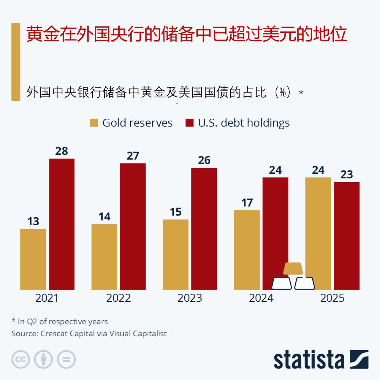 黄金在外国央行的储备中已超过美元的地位 自 1996 年以来,外国央行的黄金储备首次超过了美国国债的储备量,这标志着全球储备管理领域的一个历史性转折点。Visual Capitalist发布的数据显示,在 2025 年期间,外国央行储备中的黄金份额超过了美国国债的持有量,这一趋势是由地缘政治不确定性加剧以及对资产多元化的需求所推动的。 在 2021 年至 2025 年期间,各国央行——尤其是像中国、印度和土耳其这样的新兴市场国家的央行——大幅增加了其黄金储备。这一举措反映了更广泛的减少对美元依赖的策略,但这一策略因债务水平飙升和地缘政治紧张局势而受到阻碍。黄金被视为一种持久、便于携带且中立的资产,已成为抵御货币波动和通货膨胀的首选对冲工具。在 2026 年初,随着对避险资产的需求加剧,黄金价格飙升至历史新高。 黄金持有量超过美国国债这一现象表明全球储备正在重新调整,这将对美元在全球的主导地位产生影响。在经济与政治形势充满不确定性的当下,各国央行纷纷调整其储备结构。而黄金作为价值储存手段的永恒魅力却愈发凸显,其吸引力空前增强。