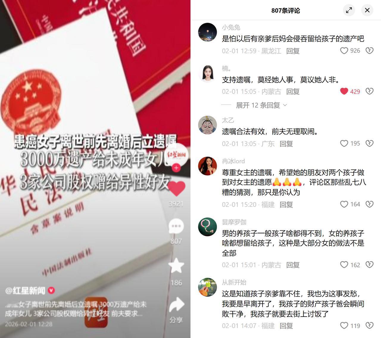 患癌女子留3000万给女儿,前夫败诉 深圳蒋女士患癌离世前,先与第三任丈夫协议离婚,随后立遗嘱将3000万遗产留给两名未成年女儿,三家公司股权赠予异性好友。前夫不服起诉,最终被法院驳回诉求。 这事儿看着有争议,实则道出了无数妈妈藏在心底的焦虑。大家都在感慨“要是我走了,孩子爸会败光财产”,这话听着扎心,却是很多中年女性的真实隐忧,当婚姻里的依靠,变成可能危及孩子未来的风险源,她们只能用最决绝的方式,给孩子搭起最后一道安全网。 与其说是不信枕边人,倒不如说是不敢赌孩子的人生。比起纠结她和前夫的私人恩怨,更该看见这份母性里的无奈:对很多妈妈来说,孩子的未来,是拼到最后也不能失守的底线。