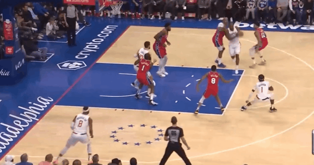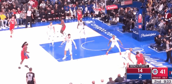 P3哈登传球过半场后立即抓早攻和恩比德发动清空一侧的边路挡拆,行进间吸引沉退祖巴茨防守注意力后、在站Nail位协防的乔治伸手刷卡的瞬间,非常隐蔽的单手不看人传球找到下顺至篮下的恩比德。