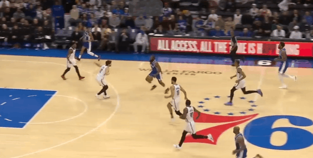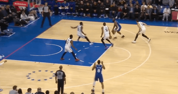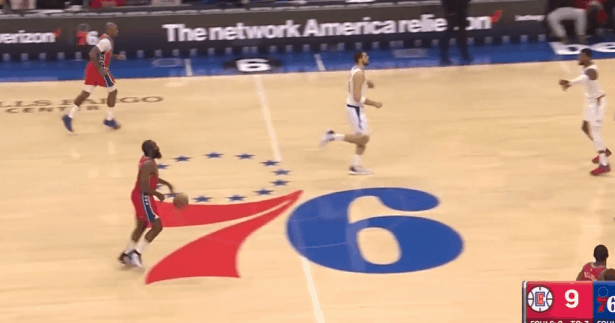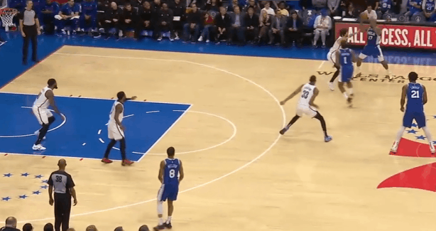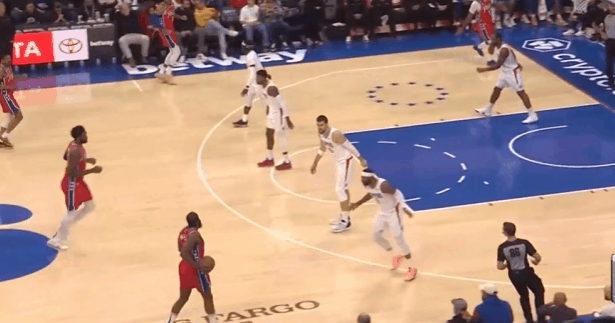 P4哈登先是回收篮下垫防,随后预判到小卡传球路线完成抄截,就地推动反击。高速推进吸引雷吉防守注意力后立即击地球领人找到右路跟进切入篮下的梅尔顿。