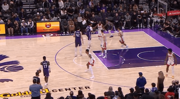 P3早期进攻阶段和雷诺发动三分线内一步的边路挡拆,罚球线急停佯装出手跳投,吸引沉退的申京上提后立即传给顺下的雷诺。