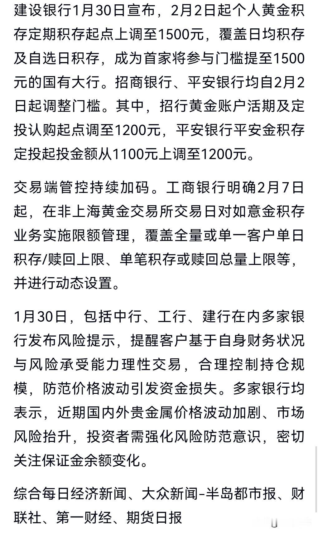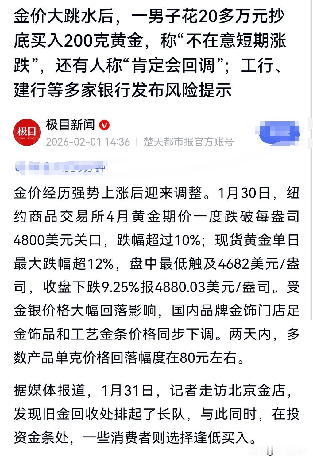 不好了不好了,一定要听劝。 近期黄金不是涨得很离谱吗? 1月30日,传来下跌的消息。 很多人购买黄金称不在乎短期的涨跌,都纷纷看好黄金以后还会再涨。 关于大家的信心,工行、建行等多家银行发布风险提示,一定要谨慎投资。 这个提示非常的及时,毕竟别人贪婪时,我们要学会恐惧。