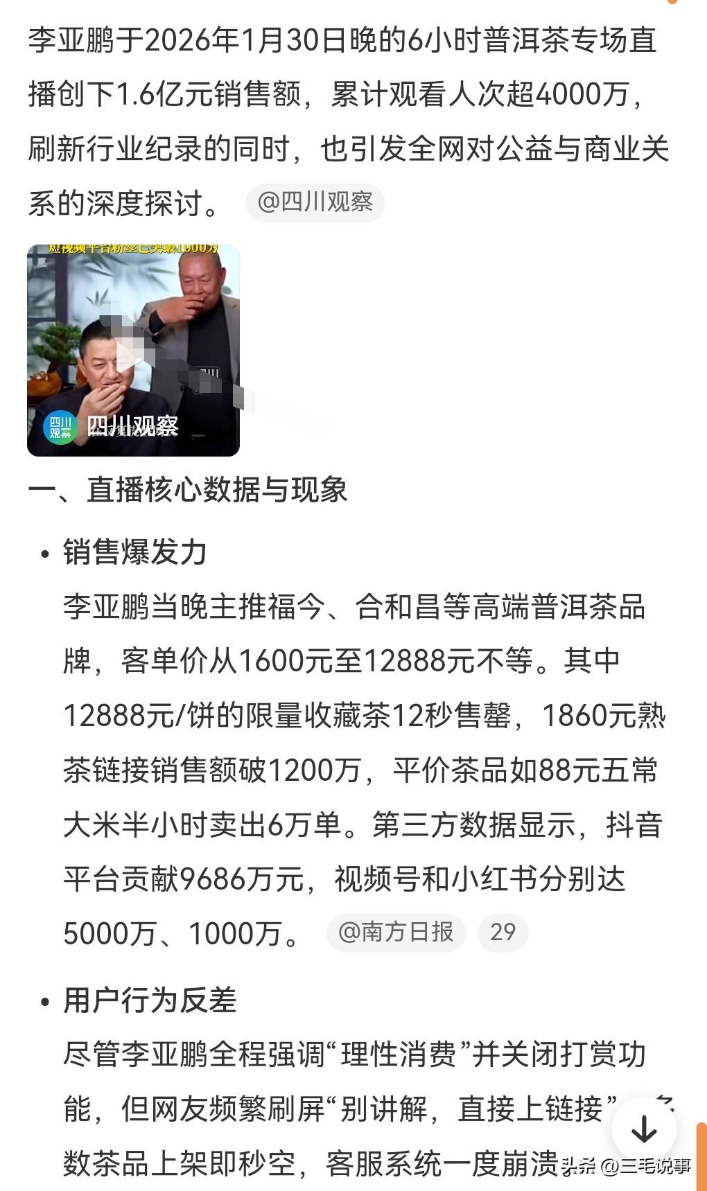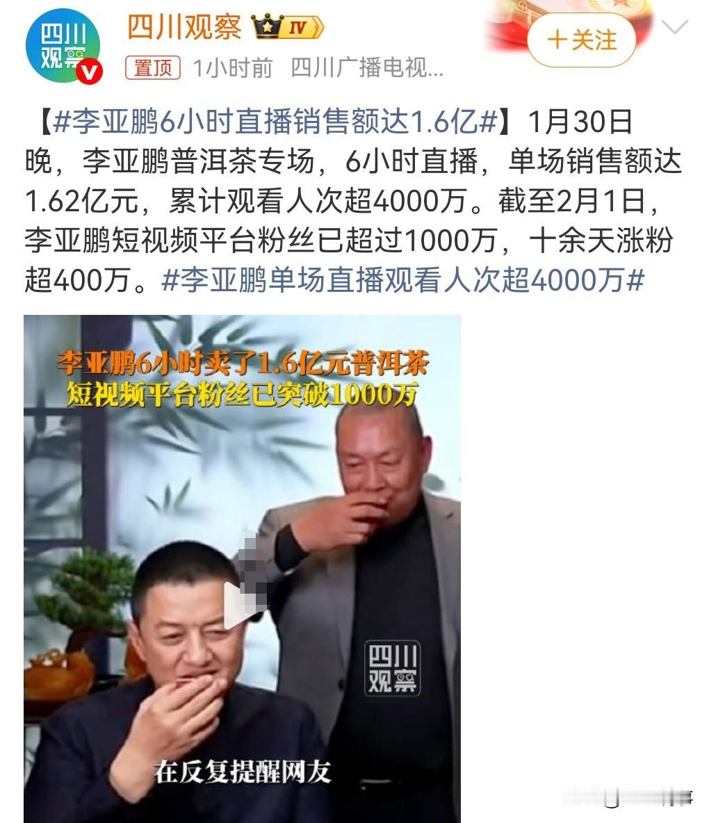 李亚鹏近期因为公益事件,口碑反转,迎来了人气大爆发。 1月30日晚,李亚鹏6小时直播销售额达1.6亿,力压与辉同行。 他卖的茶叶可不便宜啊,有一款价格12888元每饼的限量收藏茶12秒售罄。 一个茶叶这么贵,确实离谱啊。 我相信买的人应该是为了支持他做公益吧。 他创建的嫣然天使儿童医院,确实是功德无量,为这么多患儿做了唇腭裂手术。