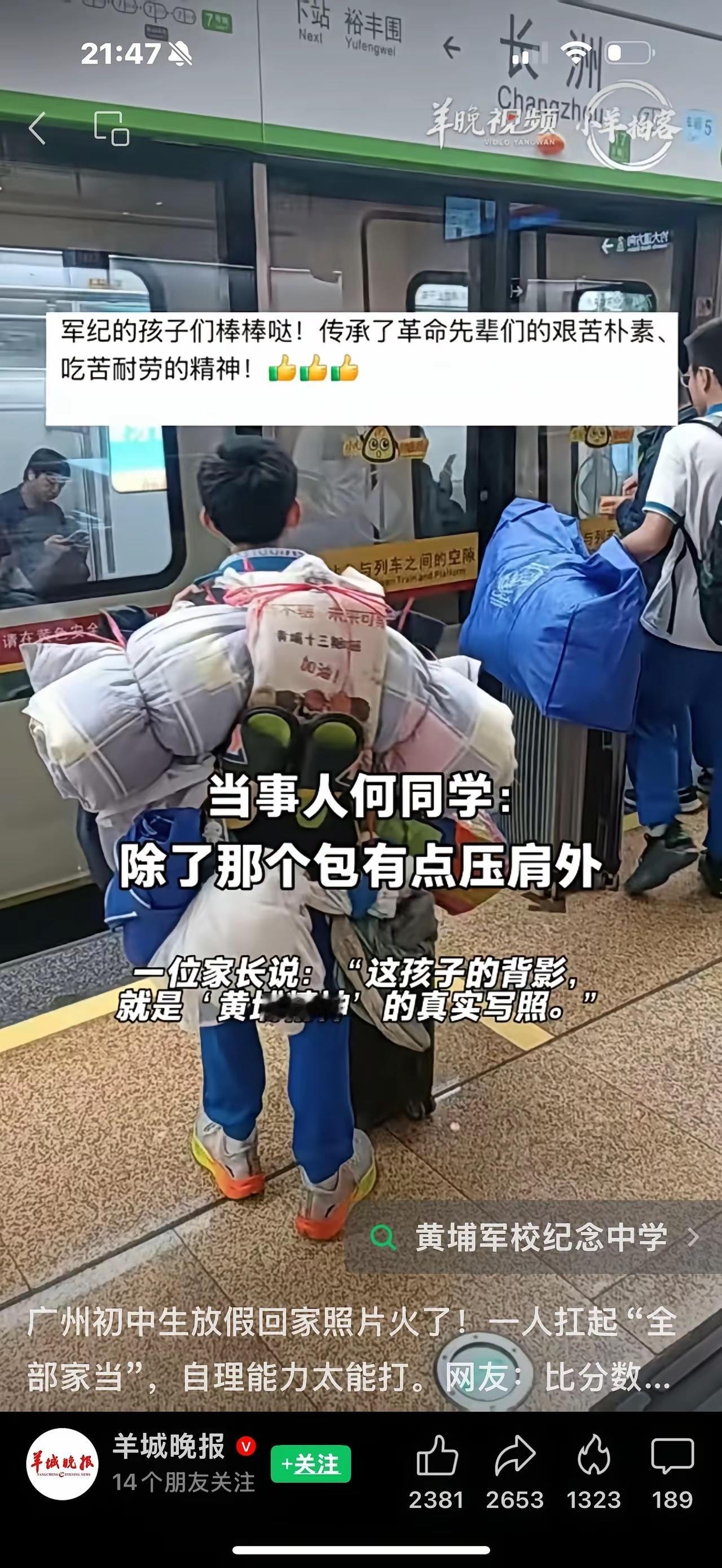 广州黄埔少年火了!无行李箱、绳捆被褥独闯地铁,不丢人,这才是少年最硬的脊梁 寒假放假潮,广州黄埔一所中学门口,上演了一幕让万千网友破防的画面。没有豪车接送,没有父母簇拥,没有精致行李箱,一名十几岁的初中生,用一根普通的绳子,把被子、蚊帐、衣物、生活用品牢牢捆成大包,独自背着、扛着,挤上地铁,踏上回家路。 这名火遍全网的少年叫何梓睿,是黄埔军校纪念中学的初二住校生,这次独自回家不是一时兴起,而是早就做好了万全准备。放假前一周,妈妈问要不要开车去接他,他直接摆手拒绝,说自己能搞定所有行李,不用大人费心。 放假前的那个周末,他特意在家演练打包行李,以书包为固定点,把被子卷成条状,蚊帐叠得整整齐齐,就连拖鞋和运动鞋都规划好了摆放位置。他反复琢磨绳子该从哪个点穿过,怎么绑才能让行李结实不松散,重的物件放进手提箱,轻的捆起来背在身上,每一步都想得很周到。 离校当天早上六点,天还没完全亮,他就起床收拾宿舍,室友过来搭把手,两人一起花了二十多分钟,终于把所有东西捆成了牢固的大包。行李堆得像小山一样,几乎快把他瘦小的身子遮住,背包带深深陷进肩膀,他却没喊一声累,拎着箱子就往地铁站走。 从学校到长洲地铁站只有四百多米,步行四分钟就能到,他全程稳稳当当,遇到台阶就慢慢挪,从没有因为行李太重停下脚步。地铁站里人来人往,不少人投来目光,他却一点都不怯场,安静排队候车,上车后主动站在角落,小心护着自己的行李。 这不是他第一次这样做,上学期放假,他就用同样的方法,把竹席、小书架这些大件物品捆好,独自坐地铁回家。他说自己参加过两次国防教育夏令营,里面教过基础的打包技巧,慢慢就练出了这手本事,不用依赖别人也能把事情做好。 梓睿的妈妈说,孩子从小就手巧,家里一直坚持适度示弱,不会什么事都替他包办。正是这份放手,让他早早养成了自立的习惯,遇到问题先想办法解决,而不是第一时间求助家人,这份心性比成绩更让人欣慰。 同一时间的校门口,不少家长开着豪车等候,有的帮孩子拎行李,有的忙着给孩子递水擦汗,对比之下,梓睿的身影更显耀眼。有人说没有行李箱太寒酸,可在网友眼里,这份不娇气不矫情的模样,才是少年该有的样子。 现在很多家庭条件好了,把孩子宠成了温室里的花朵,衣来伸手饭来张口,别说独自拎行李坐地铁,就连自己收拾书包都做不到。可真正能让孩子走远的,从来不是精致的行头和周全的照顾,而是遇事能扛、自己解决问题的能力。 梓睿背着的不只是一捆行李,更是一份责任和担当,他用一根绳子,捆出了当代少年的独立与坚韧,也给很多家长上了一课。真正的爱不是包办一切,而是给孩子锻炼的机会,让他们在小事里学会扛起属于自己的责任。 网上满屏都是对他的称赞,有人说这才是最硬的少年脊梁,有人说这样的孩子未来肯定有出息,还有人感慨,比起分数,这份自立自强才是孩子一生最宝贵的财富。 各位读者你们怎么看?欢迎在评论区讨论。