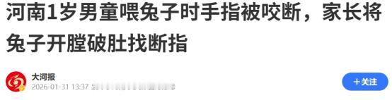 万没想到!2026年1月31日报道,河南1岁男童喂兔子时手指被咬断,家长将兔子开膛破肚找断指! 兔子看上去是非常温顺的动物,但有句话说得好:“兔子急了会咬人”!所以日常生活中,对待兔子这种温顺的动物,也应保持一定的警惕。毕竟再温顺的兔子,被惹急之后也会咬人。 就在2026年1月31日的时候,据媒体报道。河南郑州仁济医院就接诊了,一起儿童被兔子咬断手指的案例。 据家长表示,当时孩子在喂兔子,看上去是无害的喂食行动,所以家长并没有过多的阻止。但令家长没想到的是,兔子竟突然咬断了孩子的手指。 当家长发现的时候,孩子食指前面一节带着指甲盖的断指不见了。与家长在四处寻找无果之后,认为手指是被兔子吞下了肚子,于是将兔子开膛破肚的寻找,但仍旧没有找到。 最终在笼子的角落里发现了那枚仅有黄豆大小的断指,于是家人紧急带着孩子和断指赶往了医院。在来到医院之后,医生立即为孩子开通了绿色通道,对孩子进行了手术。 经过手术之后,孩子的断指顺利成活,目前恢复非常好。接诊医生在谈及这件事情的时候表示,接诊的类似病例有很多。而被兔子咬伤的几乎都是小朋友,因为孩子的小手指非常的小,很容易被当成食物,被兔子一口咬下。 这起事情的发生,给网友敲响了警钟,任何动物都存在一定的攻击性。所以不论是自身还是身边的亲人,在与动物互动的时候,都应该要注意保持一定的安全距离。同时一旦出现类似的事情,一定要带着断指紧急就医。 对此,您怎么看?欢迎评论区留言您的看法,我们一起讨论一下。 (信息来源:河南1岁男童喂兔子时手指被咬断,家长将兔子开膛破肚找断指-大河报)