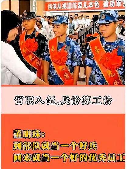 董明珠才是打工人的梦中老板! 员工想参军保家卫国,怕丢工作、断收入、耽误晋升? 格力直接把这些顾虑彻底铲平。 2025年送33名员工当兵,兵龄算工龄,工资照发,回来直接升职。 六年送出超百人,这不是空喊口号,是实打实的保障。 这年头,不画饼、不压榨,还支持员工为国尽忠的老板太少了。 普通人要的从来都不多:为国出力时,有人守好后方;为生活打拼时,有人给够底气。 董明珠做到的不是什么虚头巴脑的格局,是真正读懂打工人的体谅与担当。