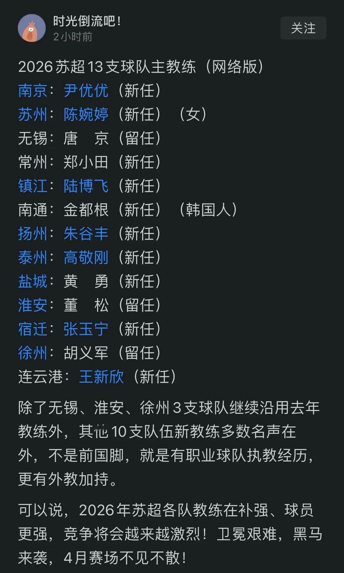 2026苏超各队主教练名单一出来,真是惊掉了我的下巴,南通队主教练竟然是个韩国人!这操作有点让人摸不着头脑啊。韩国教练有他们的一套战术体系,在亚洲足坛也有一定影响力,不过苏超和韩国联赛的风格差异可不小。南通队这是打算引入新的理念,来个风格大转变?也不知道这位韩国教练能不能快速适应苏超的节奏,和球员们磨合出默契。希望他能给南通队带来新活力,要是能带领球队打出好成绩,那这波操作就算值了,就怕水土不服,到时候可就尴尬咯。