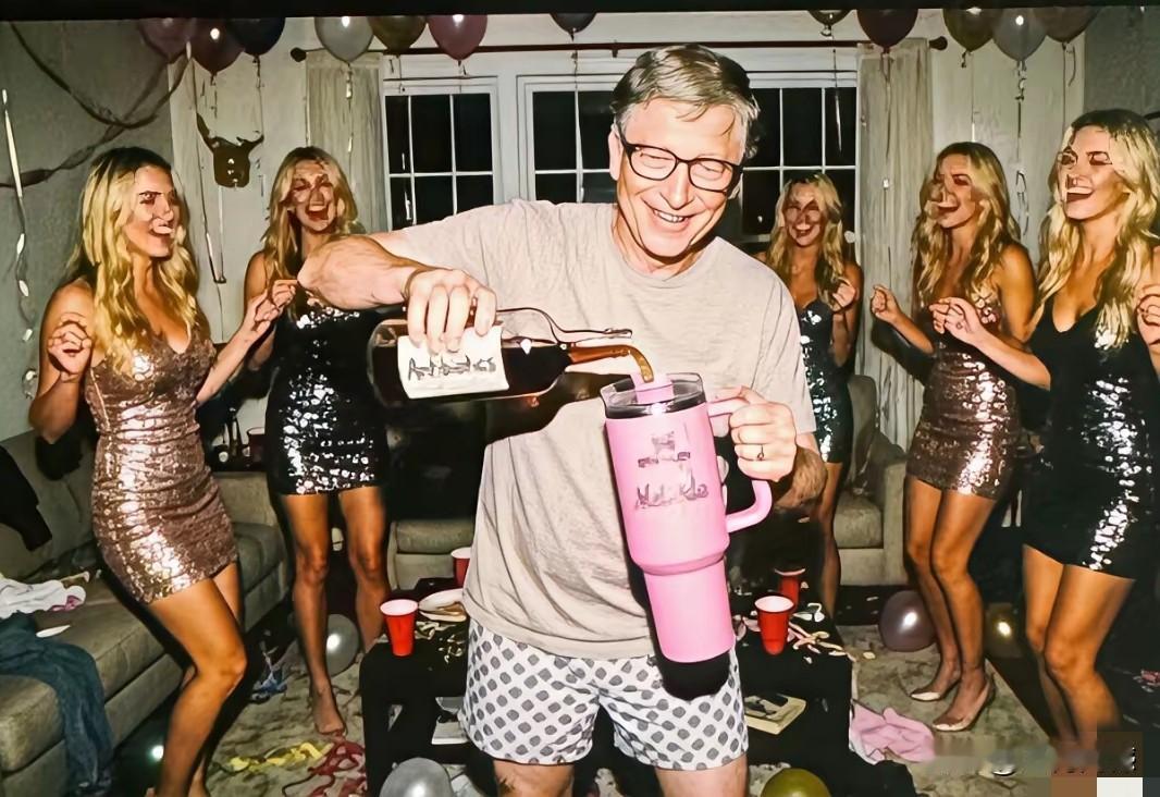 比尔盖茨作为一个有钱人,也是一个成功人士,到哪里都是受到欢迎的,他亲自拿起一瓶红酒,往一个大杯子里倾倒,身后几个金发美女为开怀大笑,又蹦又跳,感觉是非常开心的,比尔盖茨也是心花怒放,脸上也是乐开了花!