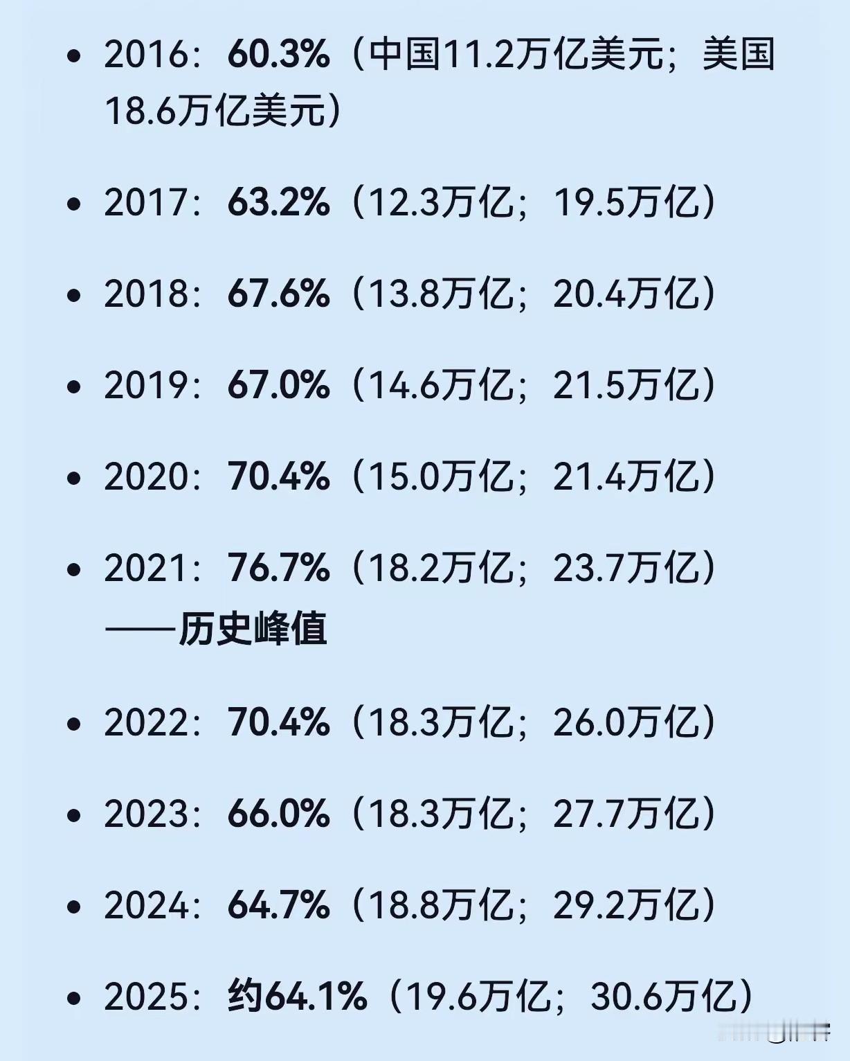 他国GDP达到美国GDP“70%魔咒”现象。这一"魔咒"并非神秘力量,而是反映了美国维护经济霸权的战略逻辑:当一个国家经济规模接近美国70%时,美国会采取全方位手段遏制其发展。美国通过规则武器化、技术封锁、金融收割、资源控制等手段系统性争夺全球利益,巩固其经济霸权。 三个历史案例: 1、日本的教训:1980年代日本经济腾飞,GDP一度达到美国的71%,但随后美国通过《广场协议》迫使日元大幅升值,导致日本出口竞争力下降,最终引发房地产泡沫破裂,陷入"失去的三十年"。 2、苏联的困境:1975年苏联GDP达到美国的67%左右,美国随即加强经济制裁并启动"星球大战计划",最终导致苏联在1991年解体。 3、德国的先例:1913年德国生产力水平达到美国的69%,随后第一次世界大战爆发,德国经济遭受重创。 中国的情况: 2021年,中国GDP达到17.82万亿美元,占美国GDP的77%,创下历史新高。2022年起,中美GDP差距开始扩大,2023年降至65%,2024年第一季度进一步降至59%。这一变化与美国自2018年开始的贸易战、科技战和金融战密切相关,包括加征关税、实体清单限制和金融制裁等措施。