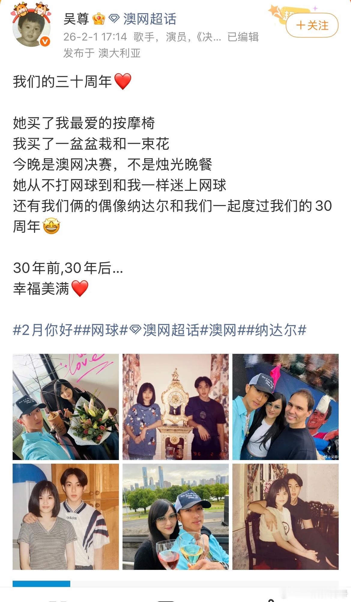 吴尊林丽吟相识三十周年吴尊夫妇澳网庆相恋纪念日吴尊晒和妻子相识三十周年从16岁的初恋到携手走过30年,吴尊和林丽吟的爱情真的太让人羡慕了!没有烛光晚餐,而是一起看澳网决赛,把彼此的热爱融入生活,这大概就是细水长流的浪漫吧❤️