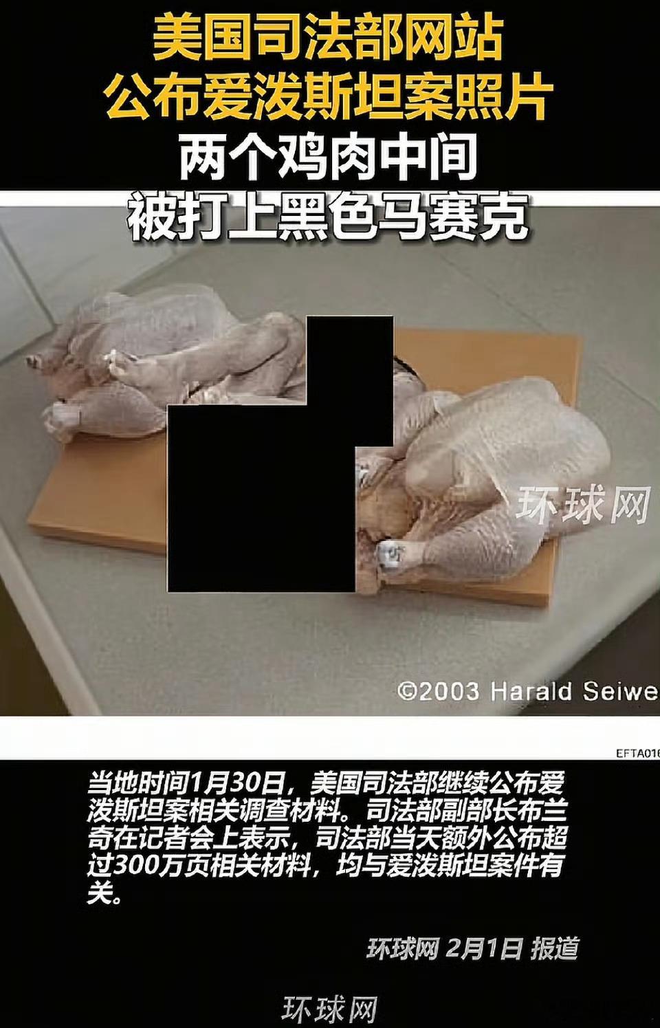 爱泼斯坦案文件显示美国真的是一个畜生统治的国家! 美国司法部当天额外公布超过300万页相关材料,均与爱泼斯坦案件有关。在公布的众多文件中,有一张编号为EFTA01646032的照片显示,两块鸡肉中间有一个物体被涂黑。而涂黑部分外网说是一个小女孩的脚,太骇人听闻,涂黑了。