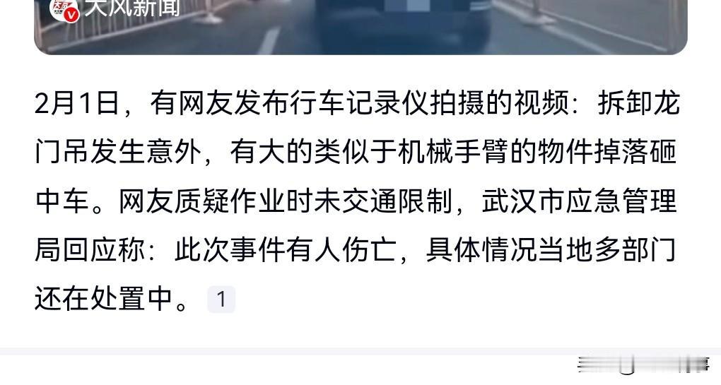 这真的是太不应该了,竟然发生这种悲剧,而这个悲剧本来是可以避免的,如果在作业时限制通行,那肯定不会发生这样的悲剧。 2月1日,拆卸龙门吊时汽车被砸中,有人员伤亡。 竟然这么大意,必须追究相关责任人的责任,必须向受害者家属作出巨大赔偿。