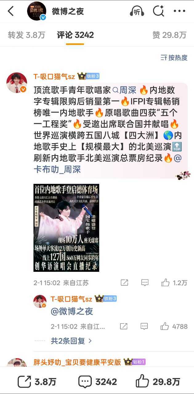 微博之夜两天控评周深粉丝前排全占,就连内赞都比别人外赞高,厉害之前的投票pk也六